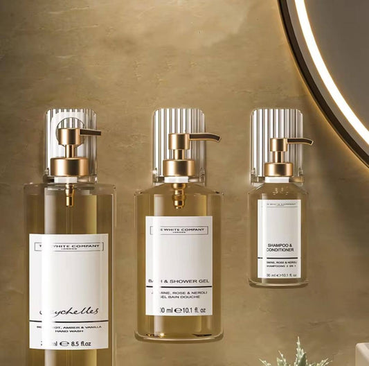 WALL mounted shower gel bottle rack holders designed to hold pump-style bottles