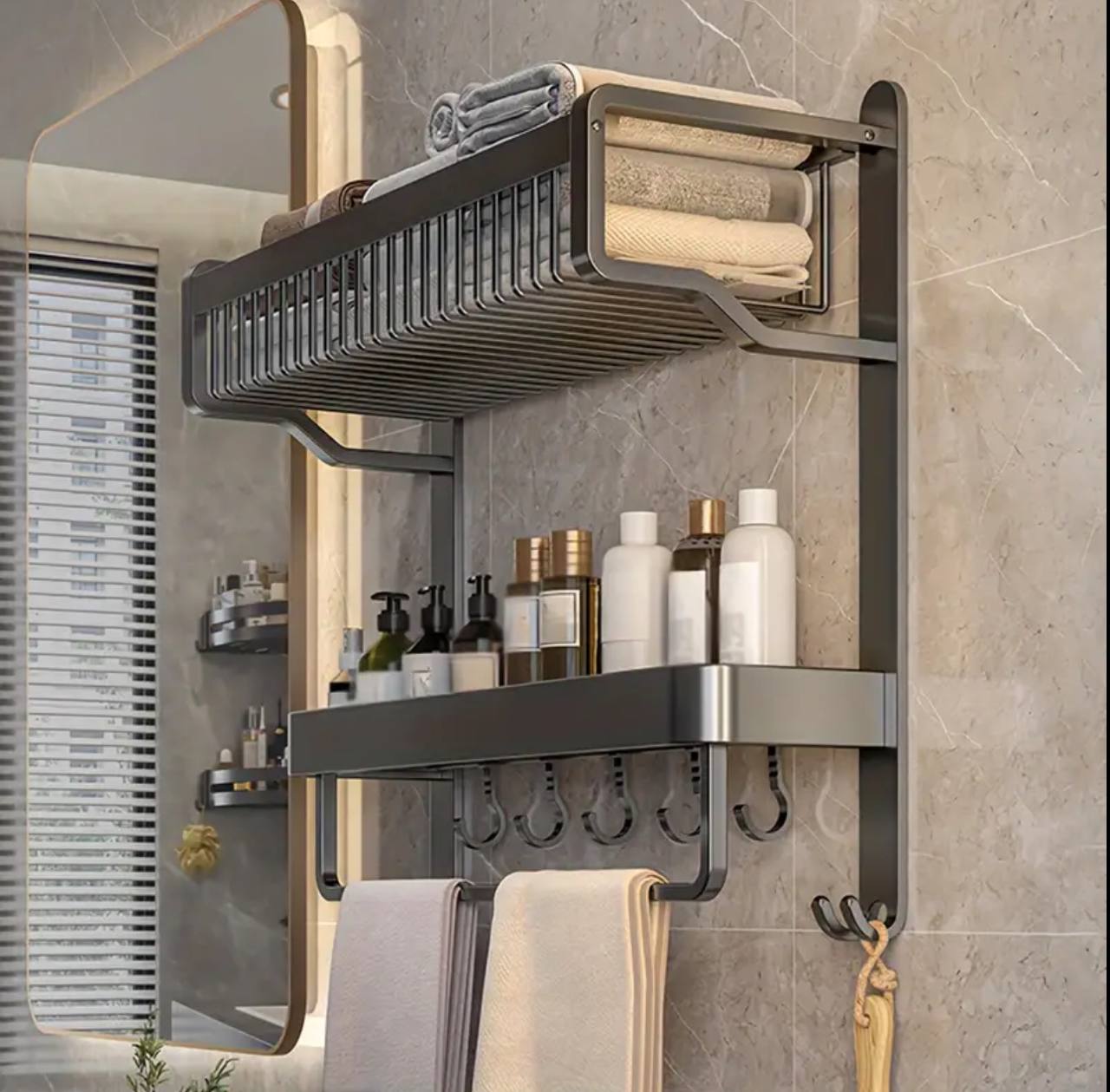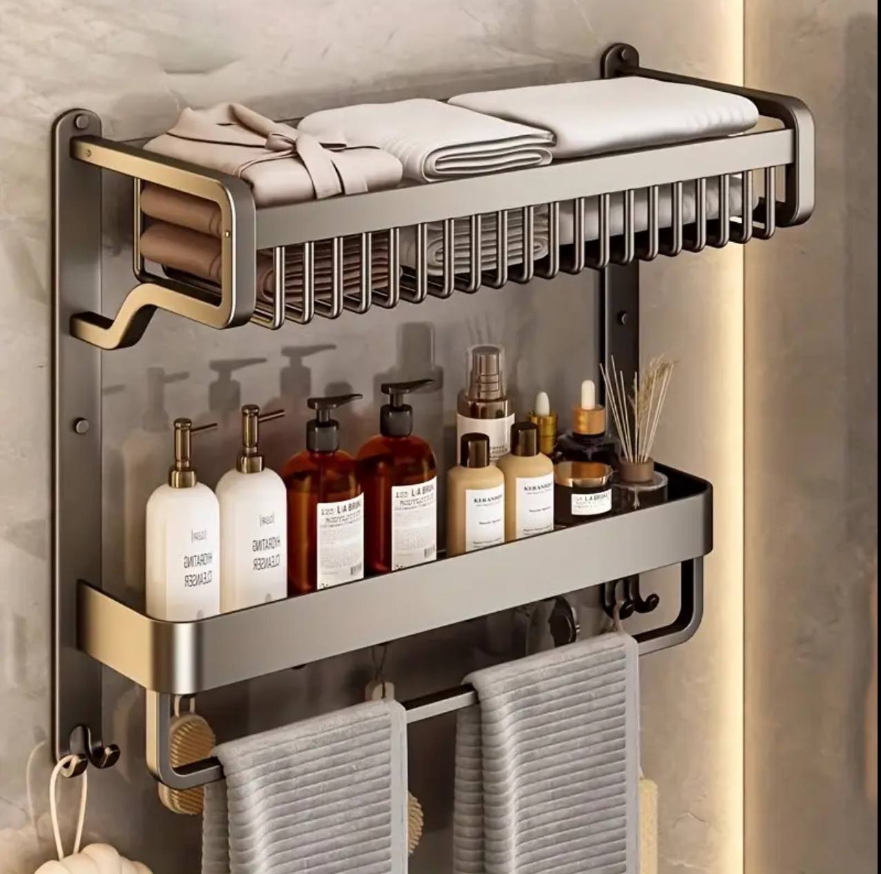 Maximize bathroom space with our 2-Layer Towel Rack! This versatile piece includes a shelf for towels, a shampoo bottle holder, and a mouthwash cup holder. Featuring a convenient hook for extra storage, it’s the perfect solution for organizing your bathroom essentials