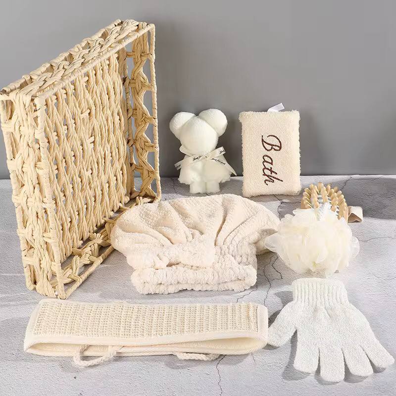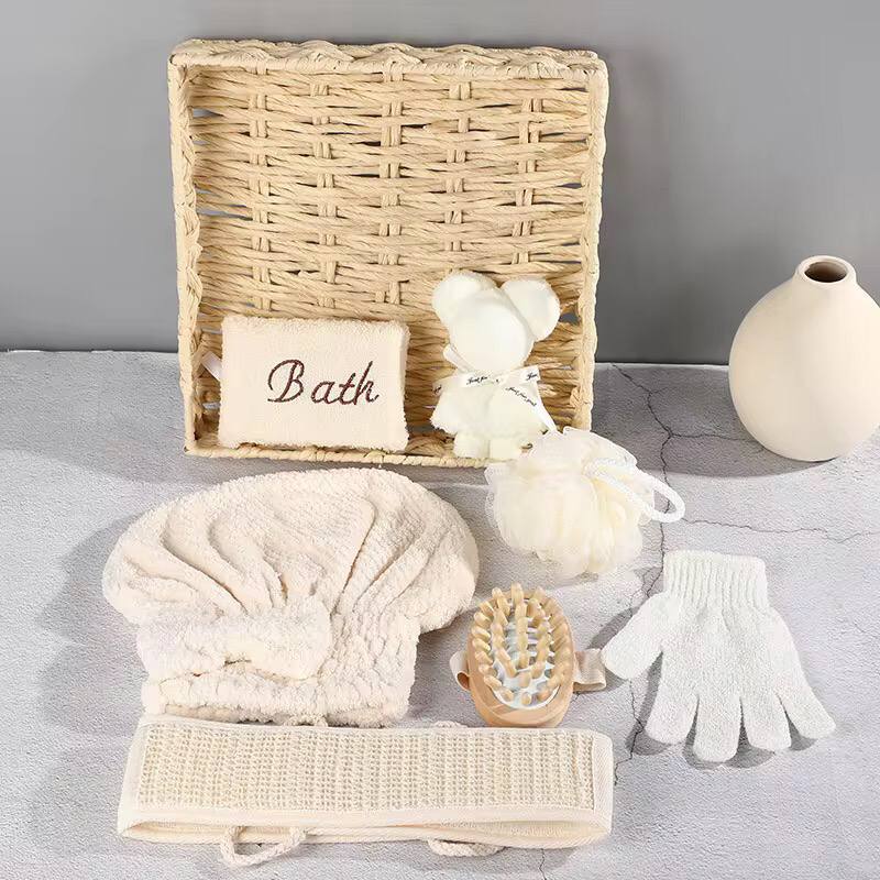 Pamper yourself or a loved one with this adorable bear basket spa gift set! Includes a sisal bath flower, back scrubber, gloves, and massager for the ultimate skincare experience. Perfect for relaxation, self-care, and gifting to someone special!