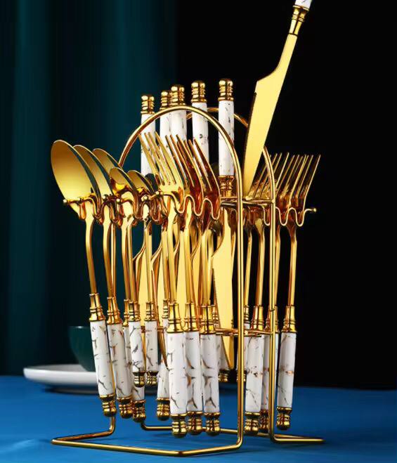 Dine in luxury with our 24pcs gold marble cutlery set with stand! Stainless steel, gold-coated with ceramic handles in black and white. Includes spoons, forks, teaspoons, and butter knives—perfect for elegant Western dining occasions.