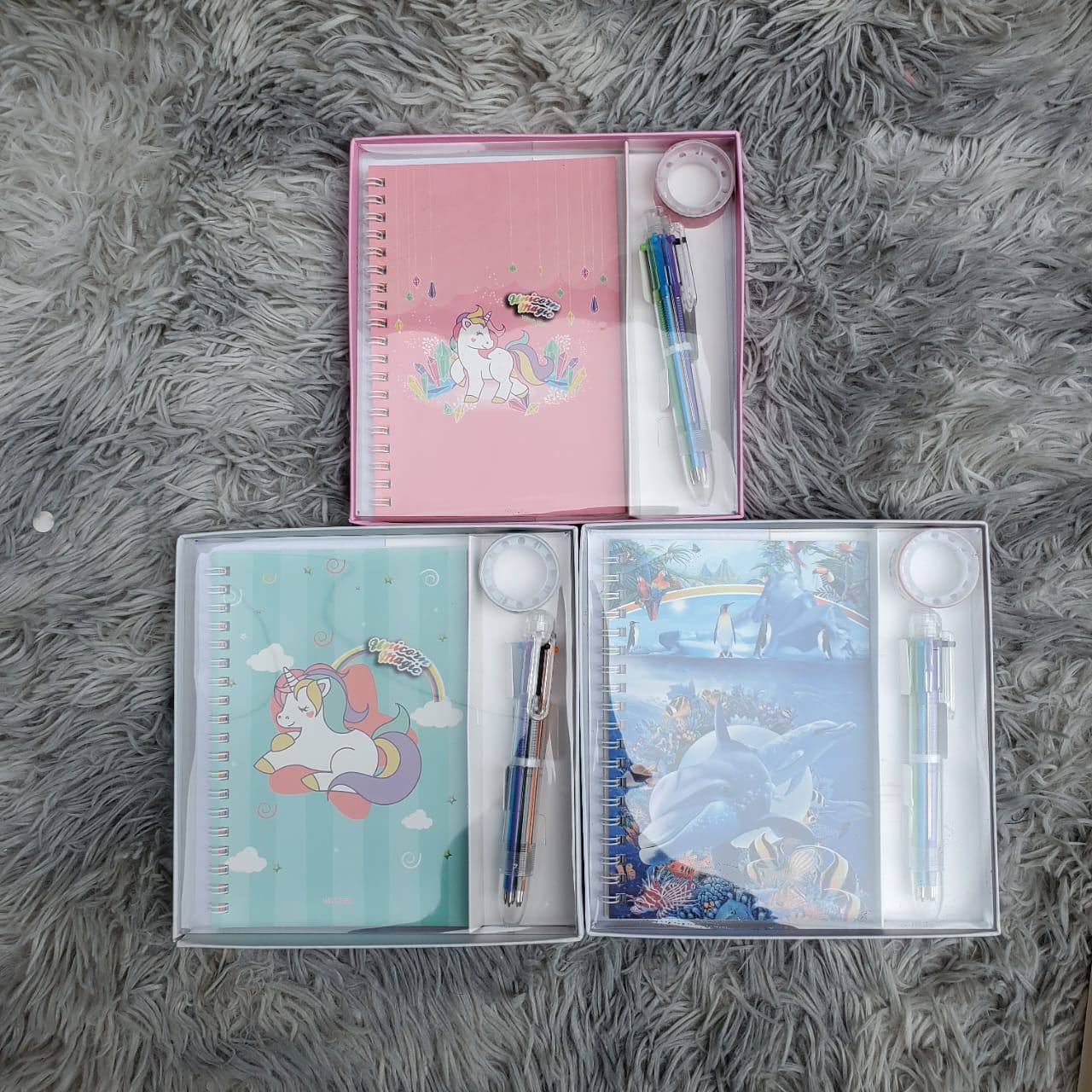 Add a touch of magic with our 3-in-1 Unicorn Notebook set! Includes a dreamy unicorn-themed notebook, pen, and tape—all beautifully packed in a gift-ready box. Perfect for school, journaling, or unicorn lovers!