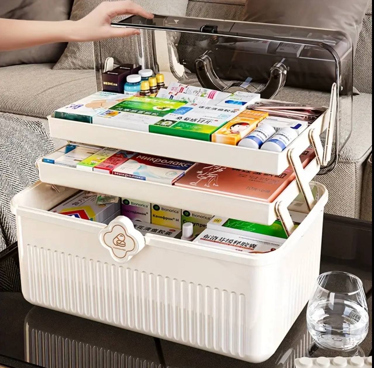 Keep essentials organized with this 3-Layer Portable Medicine Storage Box, ideal as a first aid kit or family organizer. Featuring multiple fold-out compartments, durable lightweight plastic, and a carry handle, it’s perfect for home or travel.