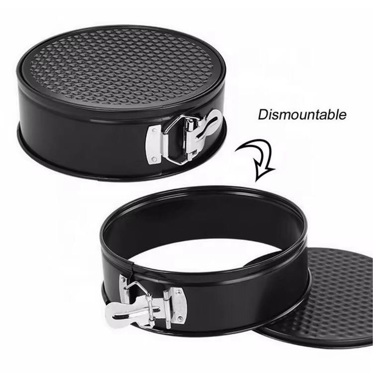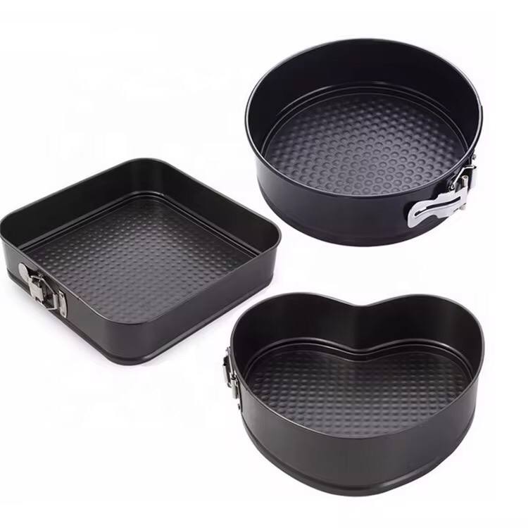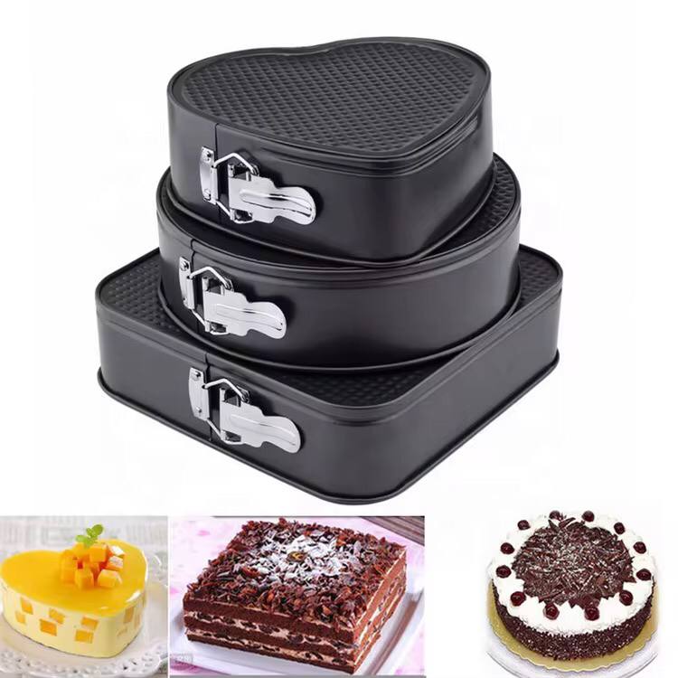Bake like a pro with this 3-piece non-stick baking tin set! Includes round, square, and heart shapes. Durable carbon steel with spring buckles and removable bottoms for easy release. Perfect for any kitchen!