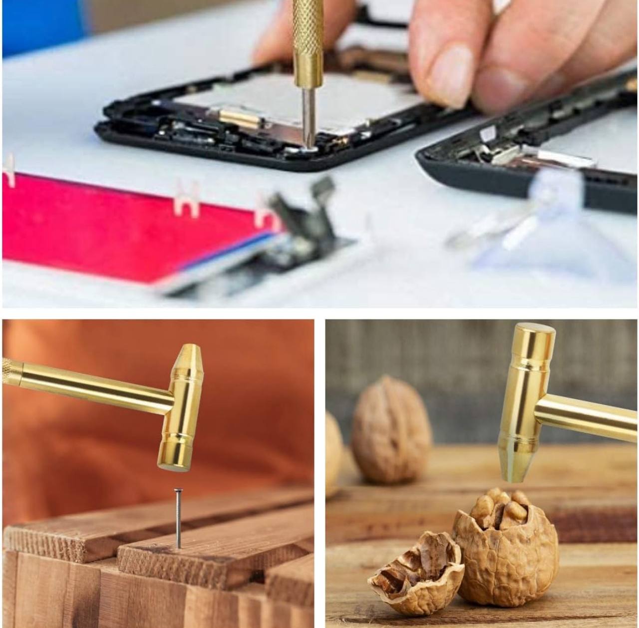 Tackle quick fixes with this 5-in-1 multifunction mini hammer and screwdriver set. Made from durable copper alloy in a sleek gold finish, it's compact, detachable, and perfect for everyday tasks.