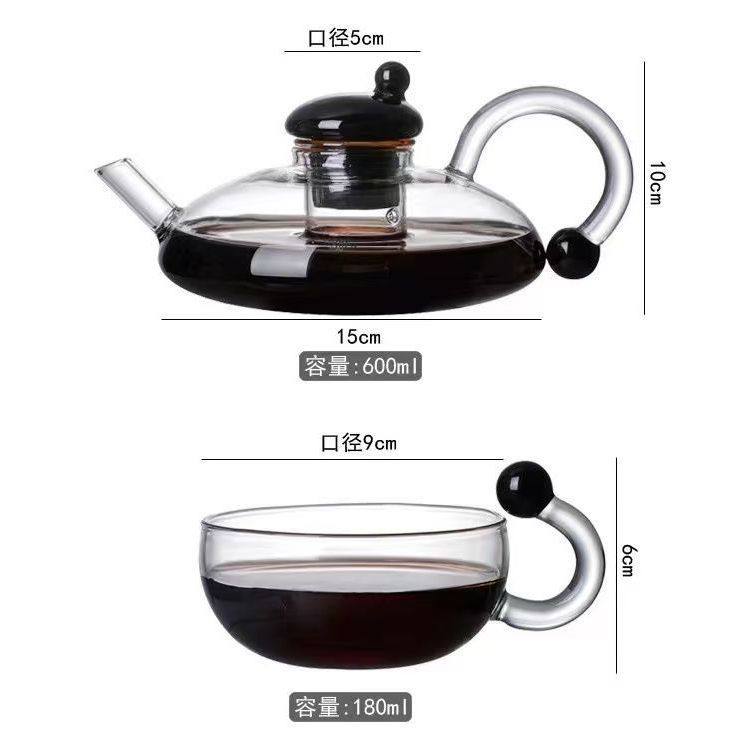 Enjoy tea time with our 5pcs heat-resistant glass tea set in dark and clear design. Includes 4 cups (280ml each) and 1 kettle (600ml) with infuser. Elegant, durable, and perfect for everyday use or gifting.