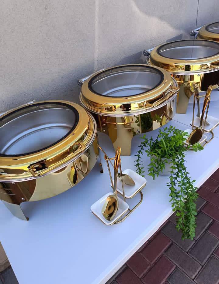 Elevate your buffet setup with this luxurious 6L hydraulic auto-close chafing dish in stunning gold. Designed for elegance and convenience, it keeps food warm while ensuring smooth, silent closing. Perfect for weddings, banquets, and upscale dining experiences