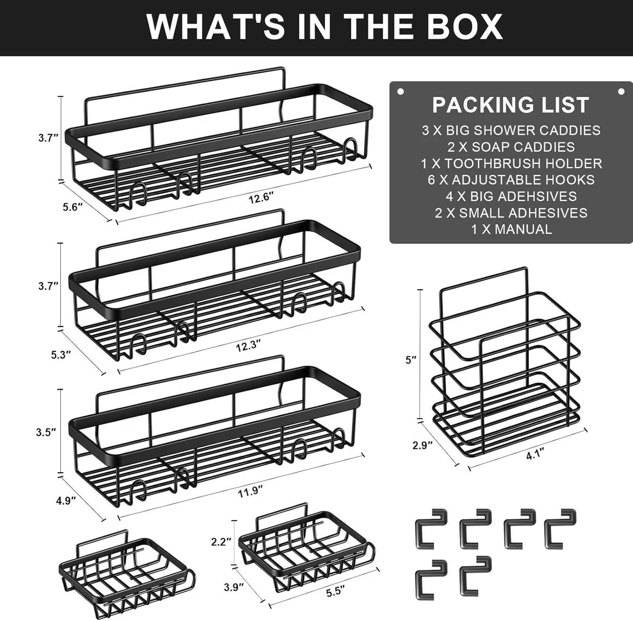 Maximize your bathroom space with our 6-Piece Shower Caddy Shelf Set! Rustproof and drill-free, it features strong adhesive backing for enhanced load capacity. Perfect for smooth surfaces like tiles, marble, glass, and wood—keep your essentials organized and easily accessible!
