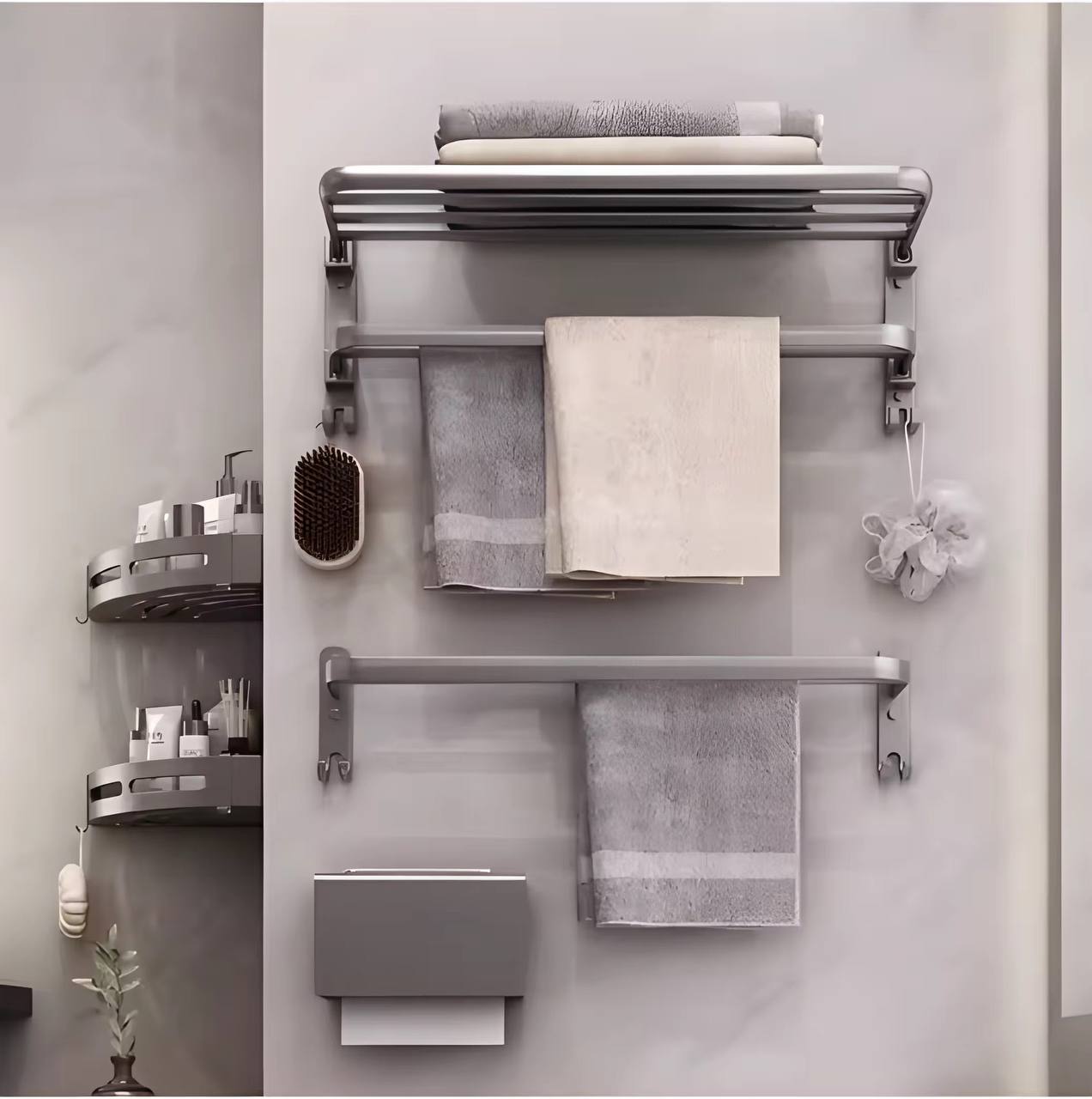 Upgrade your bathroom with this 7-piece black multifunctional aluminum towel rack set. Strong, rust-resistant, and stylish, it provides organized storage for towels and essentials, maximizing space while giving your bathroom a sleek, modern look.
