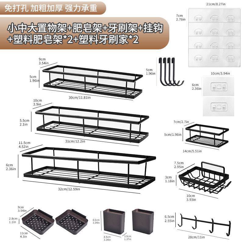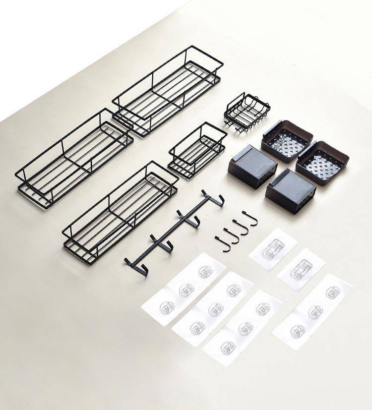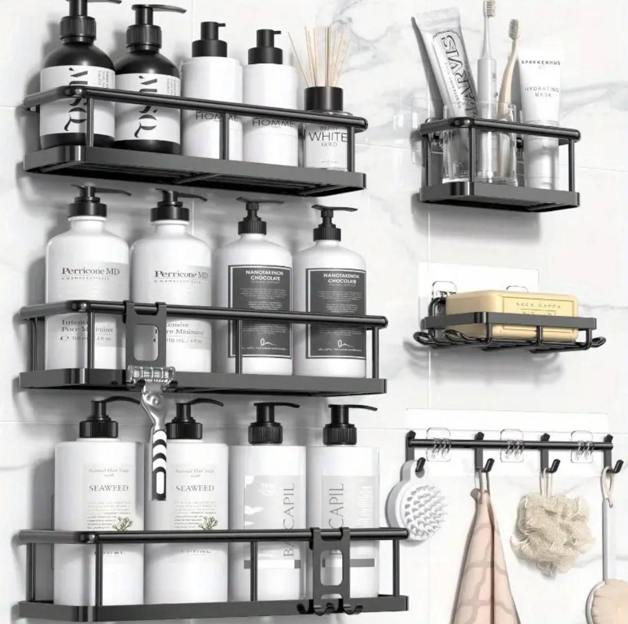Transform your bathroom with this 8-piece organizer set in sleek matte black. Includes racks, soap holders, razor holder, 4-in-1 hooks, and adhesive mounts. Easy to install, water-resistant, and rust-proof—style meets smart storage.
