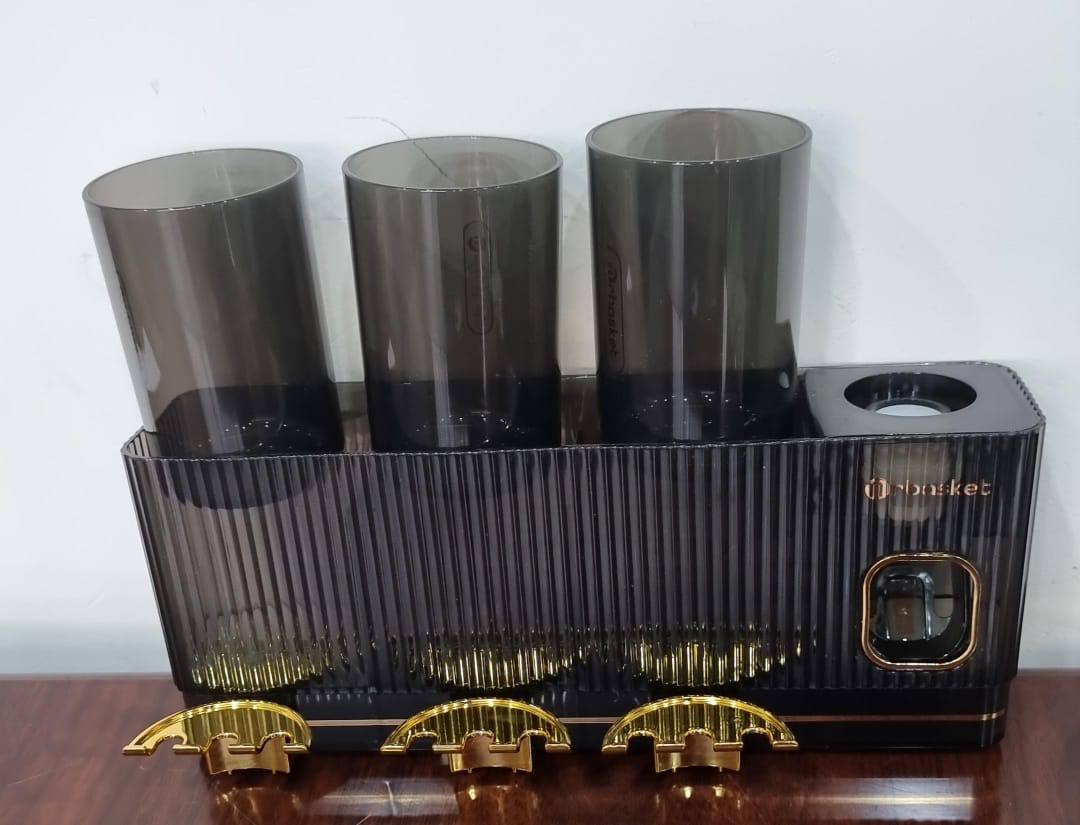 Streamline your bathroom with this acrylic integrated toothbrush holder and toothpaste dispenser set! Features inverted design for hygiene, 3 rinse cups, and organized storage—stylish, compact, and perfect for a clutter-free countertop.