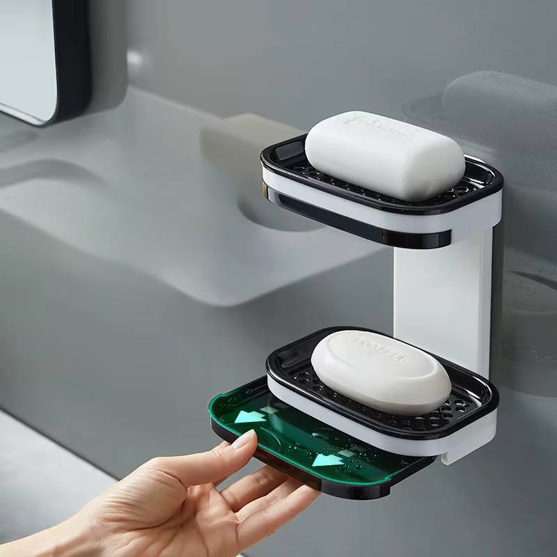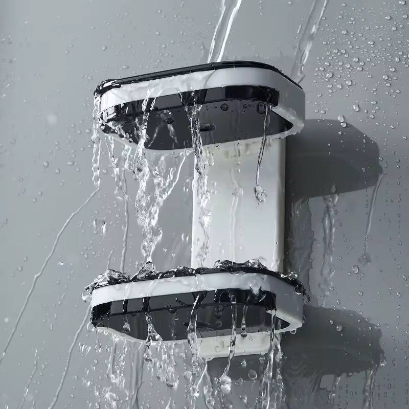 2-tier acrylic soap dish for wall or countertop use—no drilling needed! Waterproof, durable ABS material with strong self-adhesive. Perfect for storing soap, sponges, and more in the bathroom, kitchen, or shower.