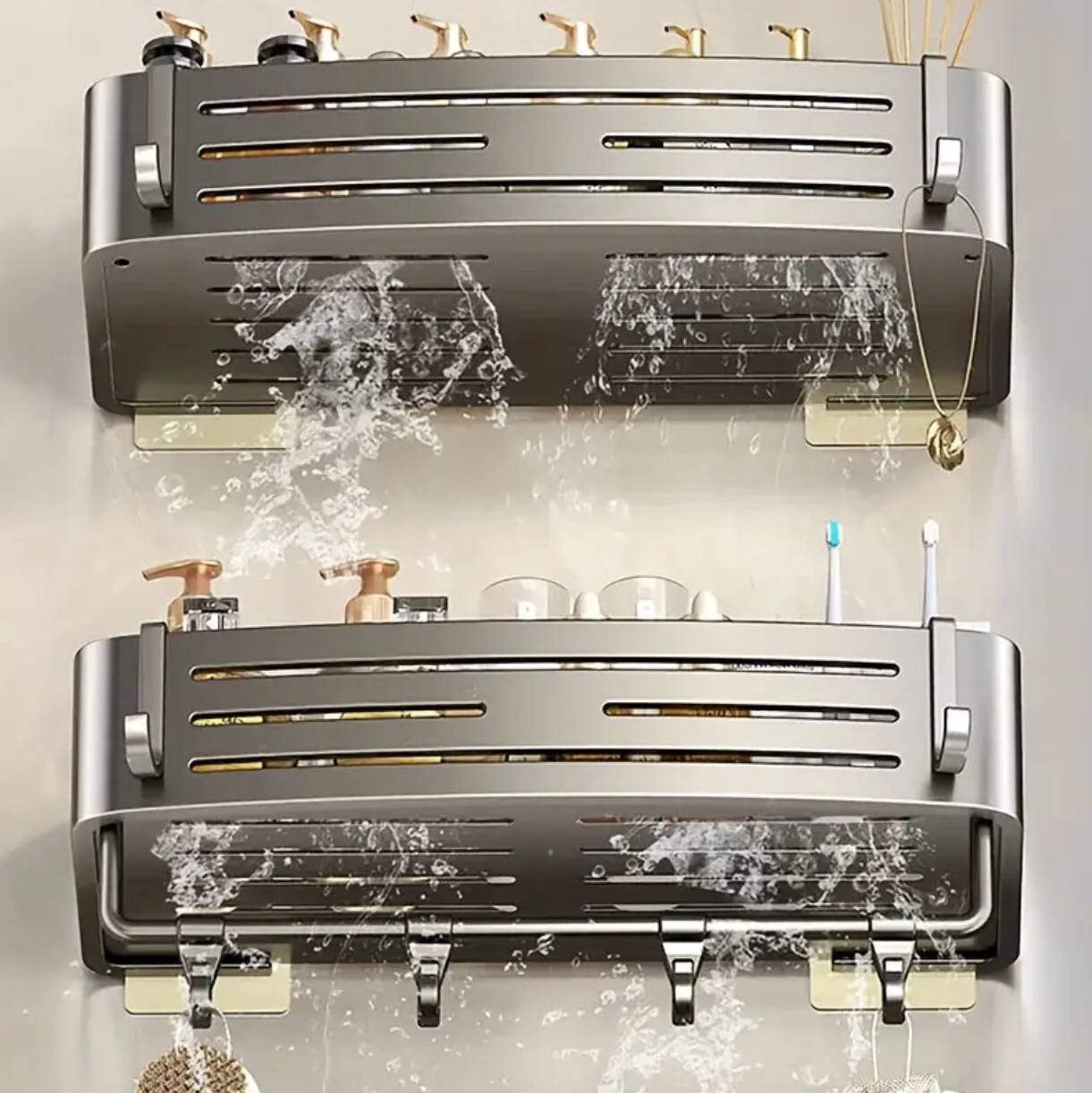 Upgrade your bathroom with the Aluminum Wall-Mounted Bathroom Shelf Set (2PCS)! Rust-resistant for durability, each shelf features built-in hooks for towels and accessories. Enjoy easy, no-drill installation with strong adhesive stickers—sleek, functional, and perfect for an organized, modern space