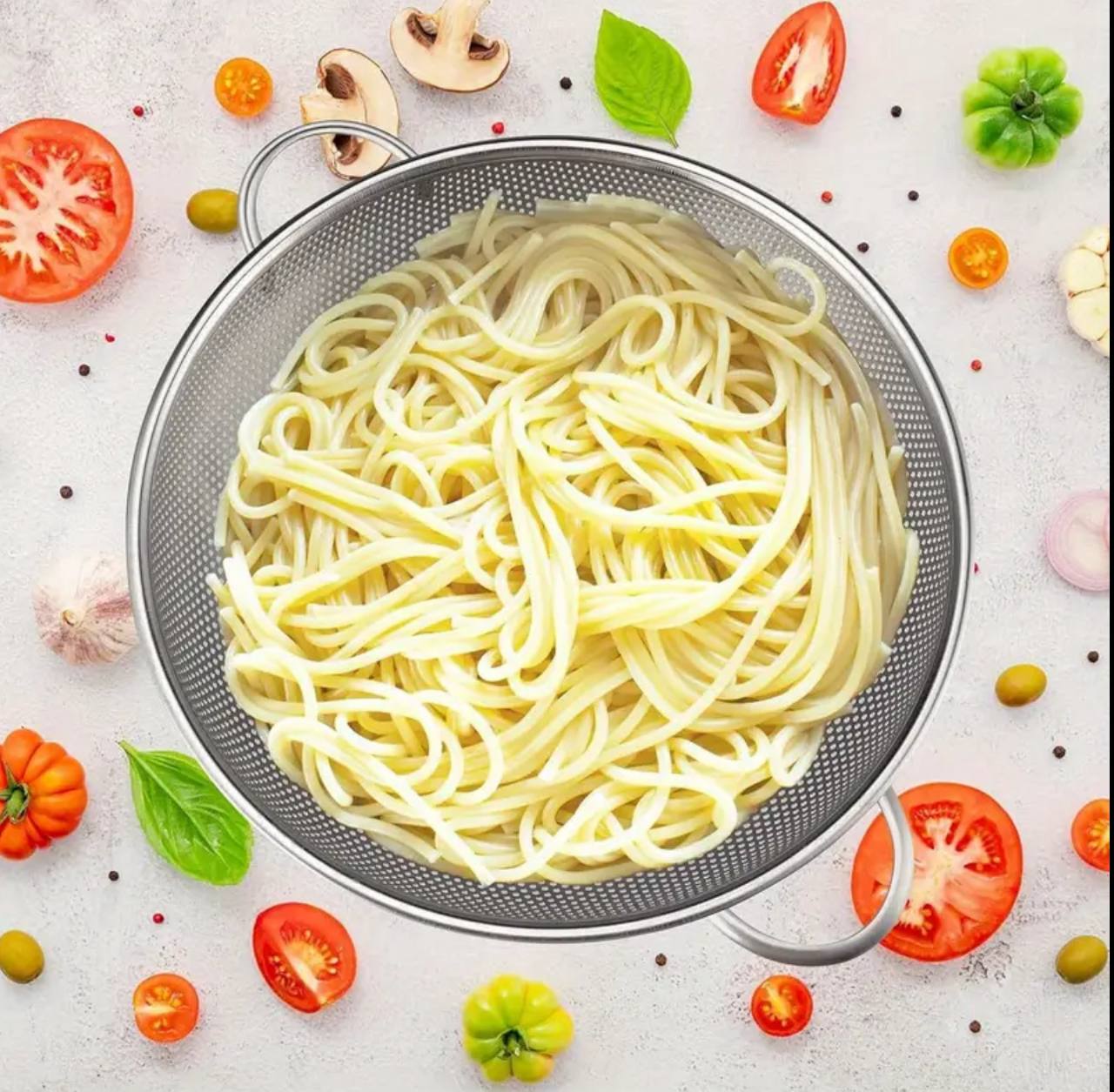 Simplify kitchen tasks with this stainless steel basket strainer and colander. Perfect for washing fruits, vegetables, or rice, it doubles as a mixing or storage bowl. Durable mesh design ensures quick draining and easy cleanup.