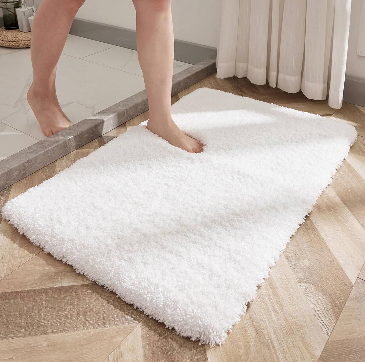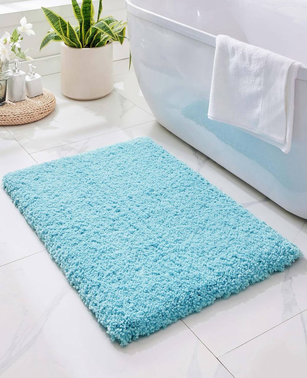 Upgrade your bathroom with our ultra-absorbent, fluffy mat! Soft, cozy texture with a non-slip rubber bottom for safety. Available in turquoise, white, and pink. Size: 45×75cm—perfect comfort and style combo!