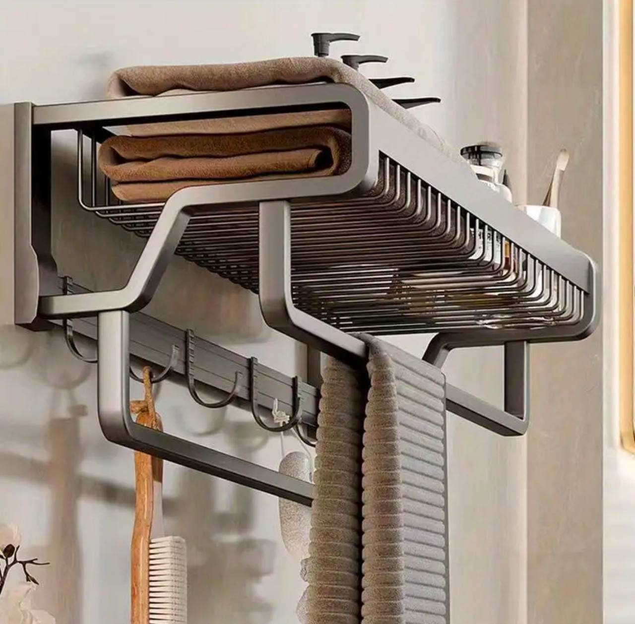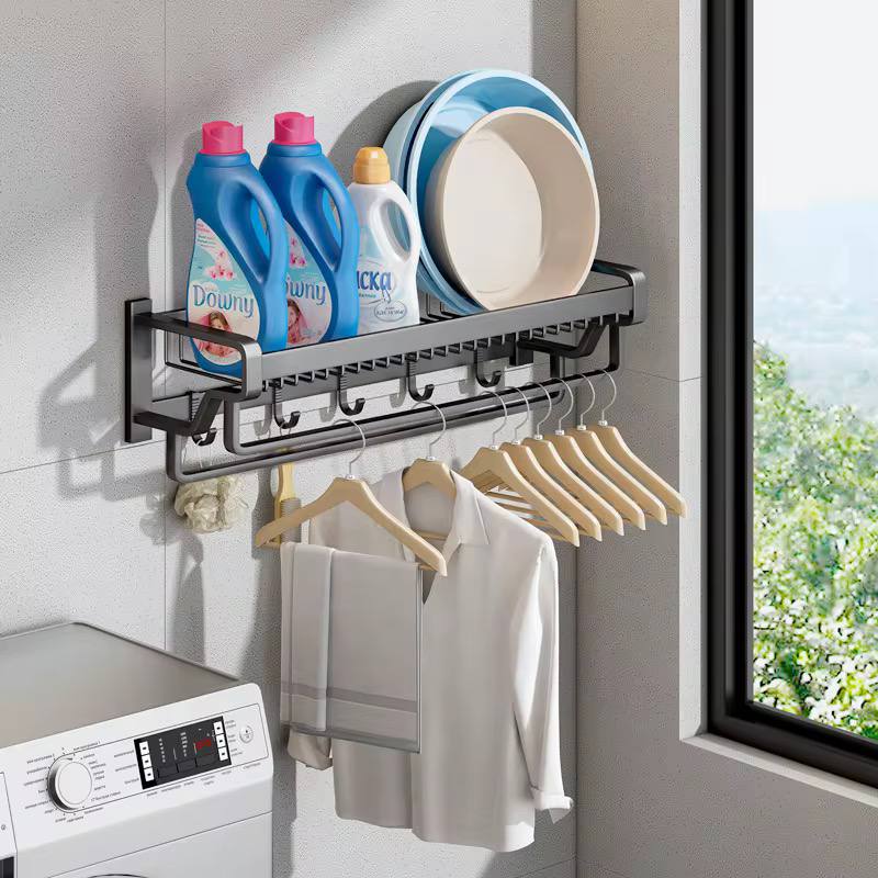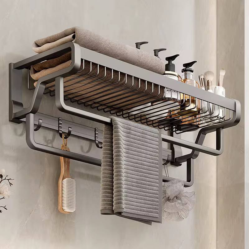 Elevate bathroom organization with this wall-mounted double-layer towel rack. Made of durable aluminum in a sleek matte black finish, it features hooks for added convenience. Install easily with screws or strong self-adhesive stickers. Size: 60cm long—modern, functional, and stylish for any bathroom décor.