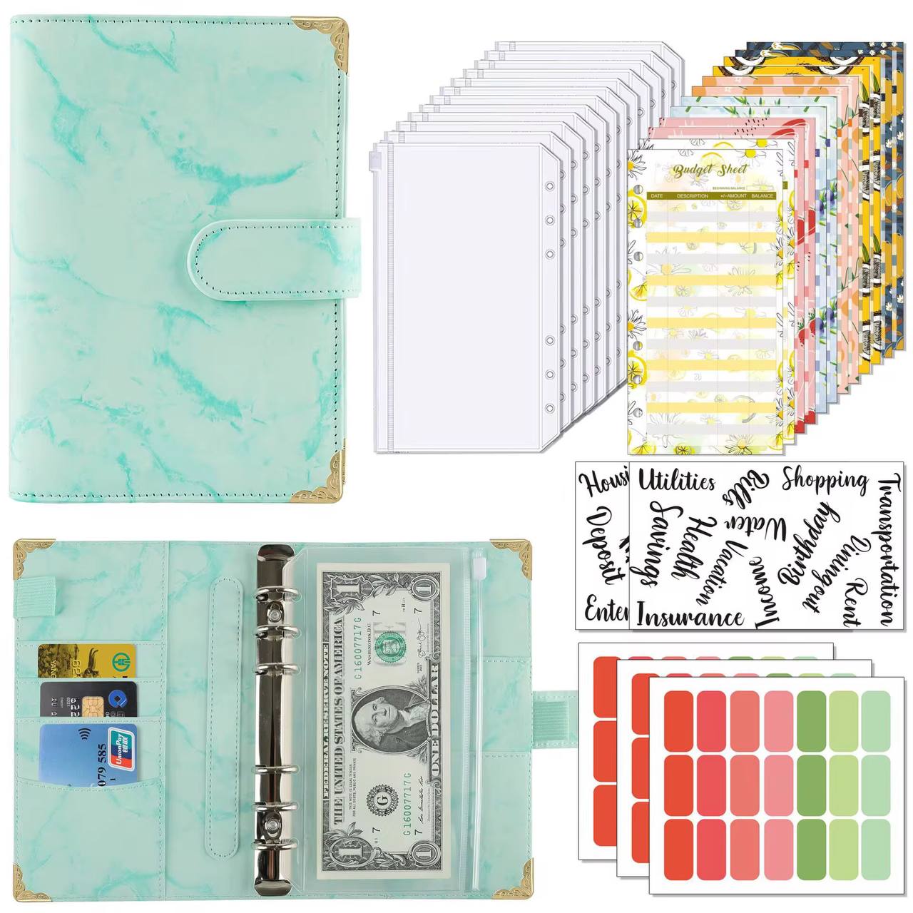 Stay stylish and organized with this luxurious A6 marble-effect budget binder. Features 12 budget sheets, 12 zipper pockets, card slots, pen holder, magnetic buckle, and gold corners. Available in turquoise, pink, and yellow.