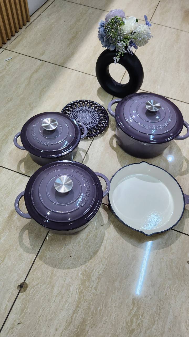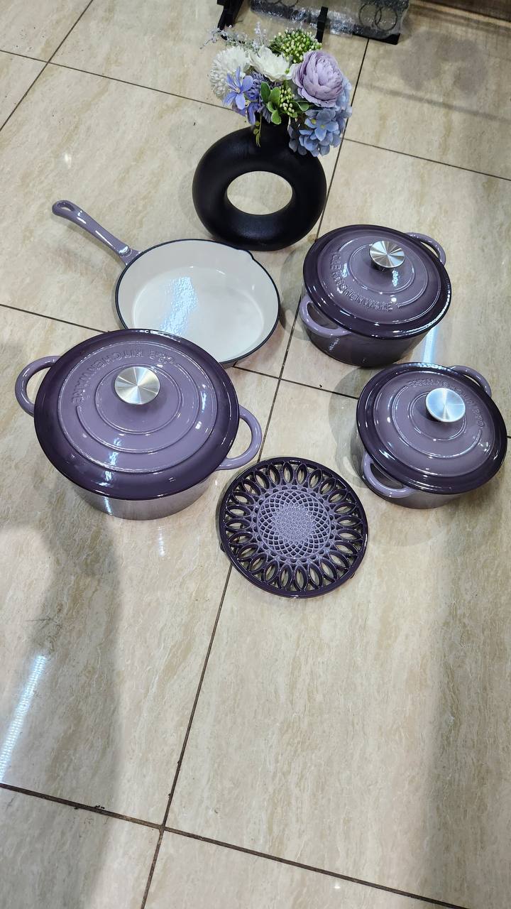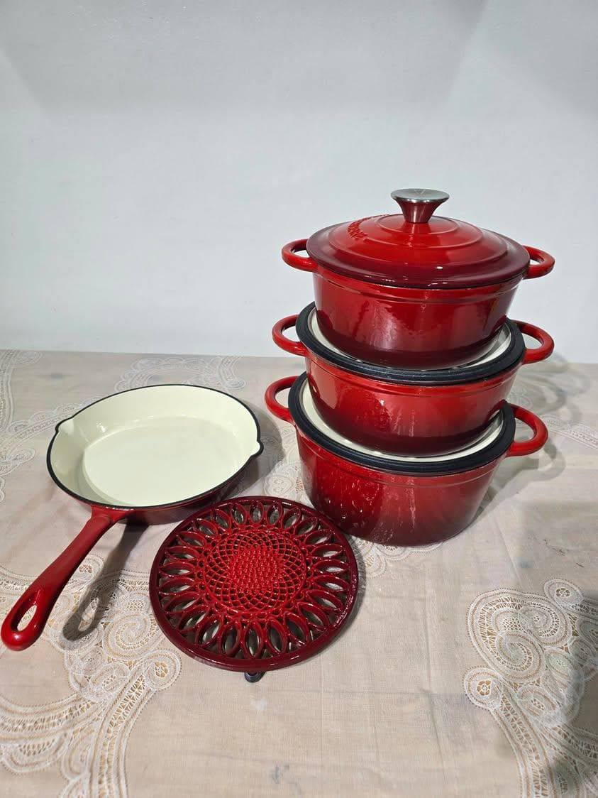 Premium cast iron Dutch oven set includes casseroles (19cm, 22cm, 26cm) and a 26cm frying pan. Durable, heat-retaining cookware ideal for slow cooking, baking, frying, and roasting. Timeless design meets exceptional performance.
