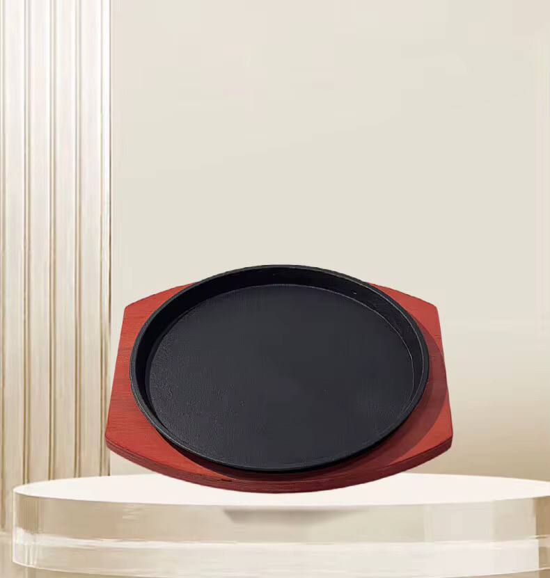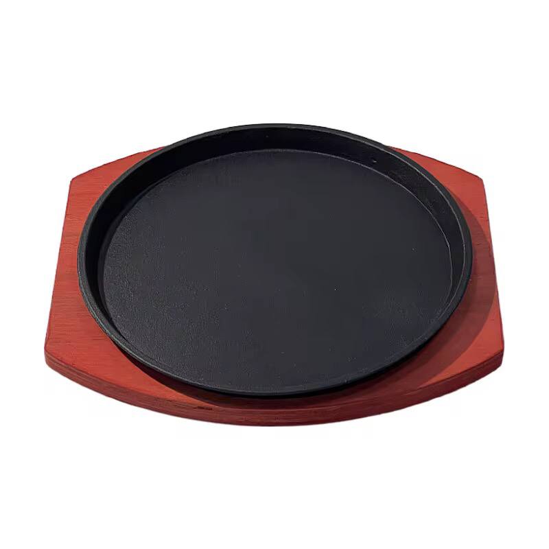 Serve restaurant-style dishes at home with our cast iron hot sizzling plate on a wooden tray. Available in oval and round shapes, it keeps food hot and flavorful. Perfect for steaks, fajitas, and more—elevate your dining experience!
