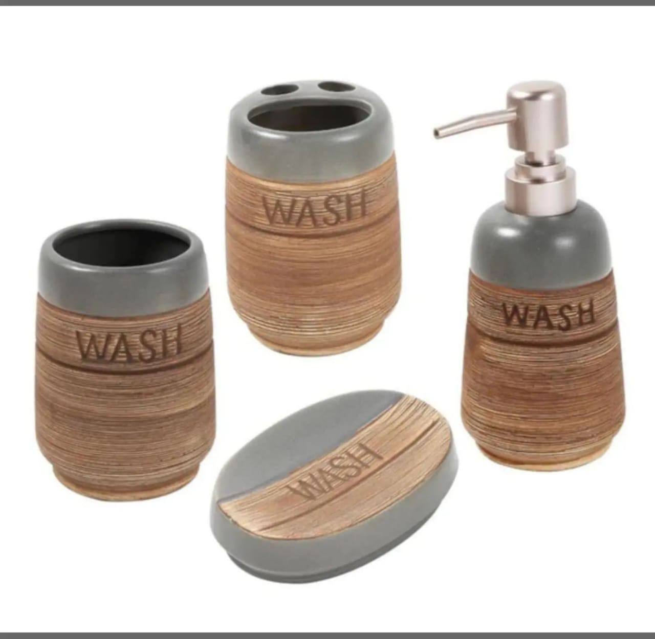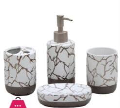 Elevate your bathroom décor with our ceramic 4-in-1 set, available in marble or woodlike designs. Includes soap dish, tumbler, liquid dispenser, and toothbrush/toothpaste holder—combining style, durability, and practicality for a coordinated, elegant bathroom upgrade.