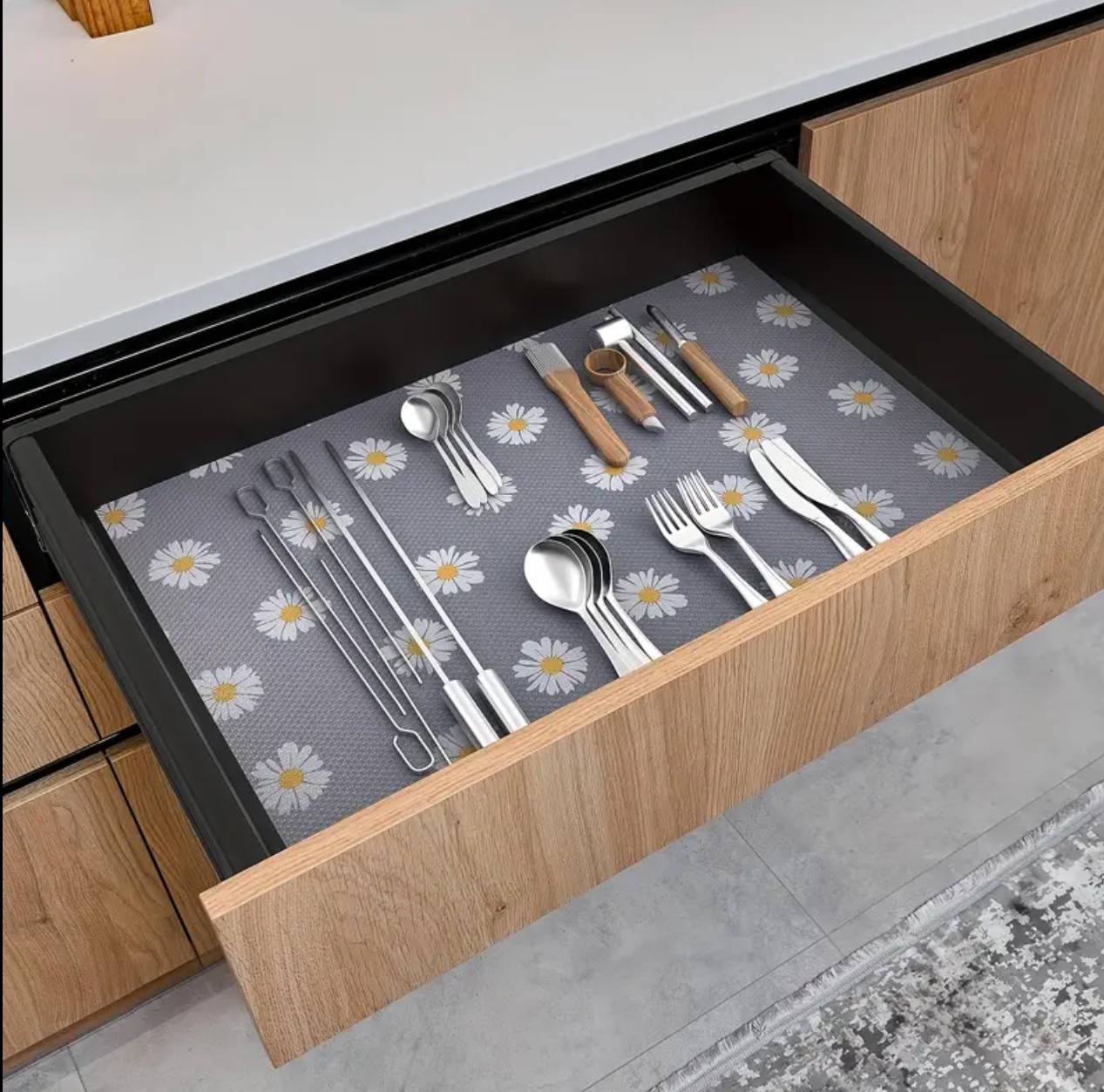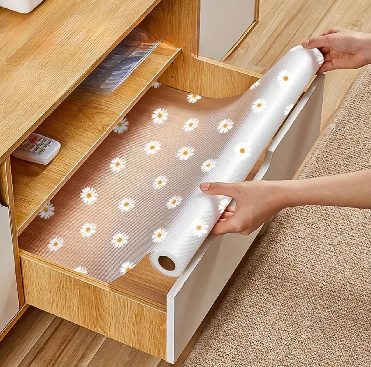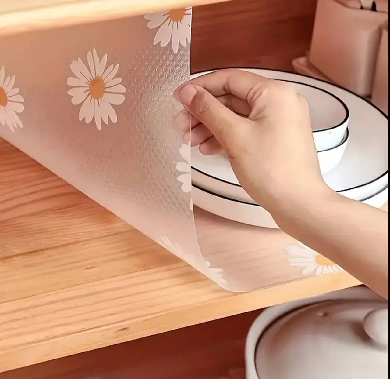 Brighten up your kitchen with our daisy-patterned drawer liners! Oil-proof and moisture-resistant, they keep shelves clean and fresh. Easy to cut and install, this 45x500 cm liner adds charm while protecting cabinets. Perfect for drawers, cupboards, and shelves