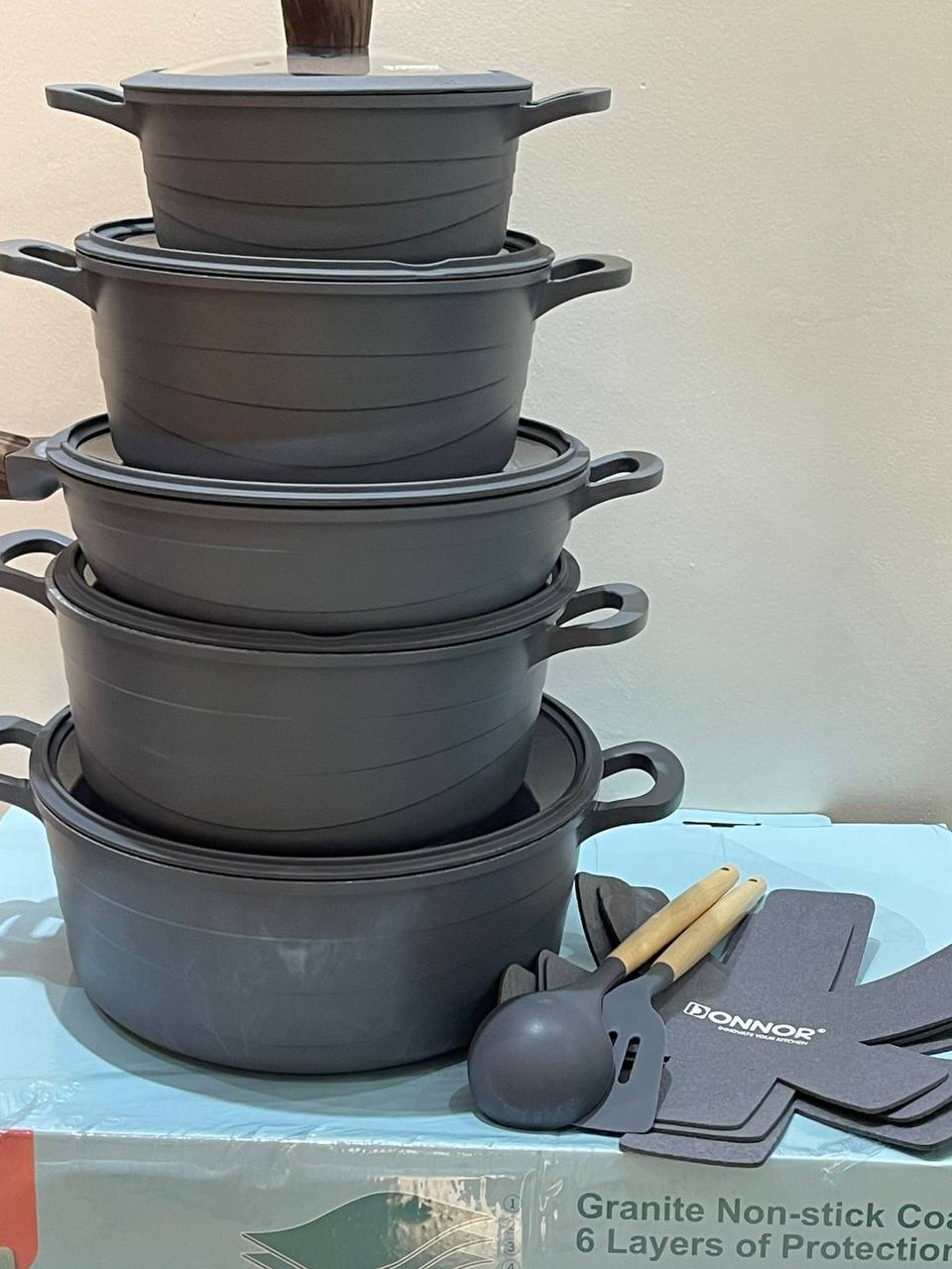 Complete your kitchen with the Donnar 15-piece sufuria set! Includes 4 sufurias, 1 pan, 5 lids, 3 heat mats, and 2 cooking spoons. Durable, stylish, and versatile—perfect for everyday cooking and gifting.
