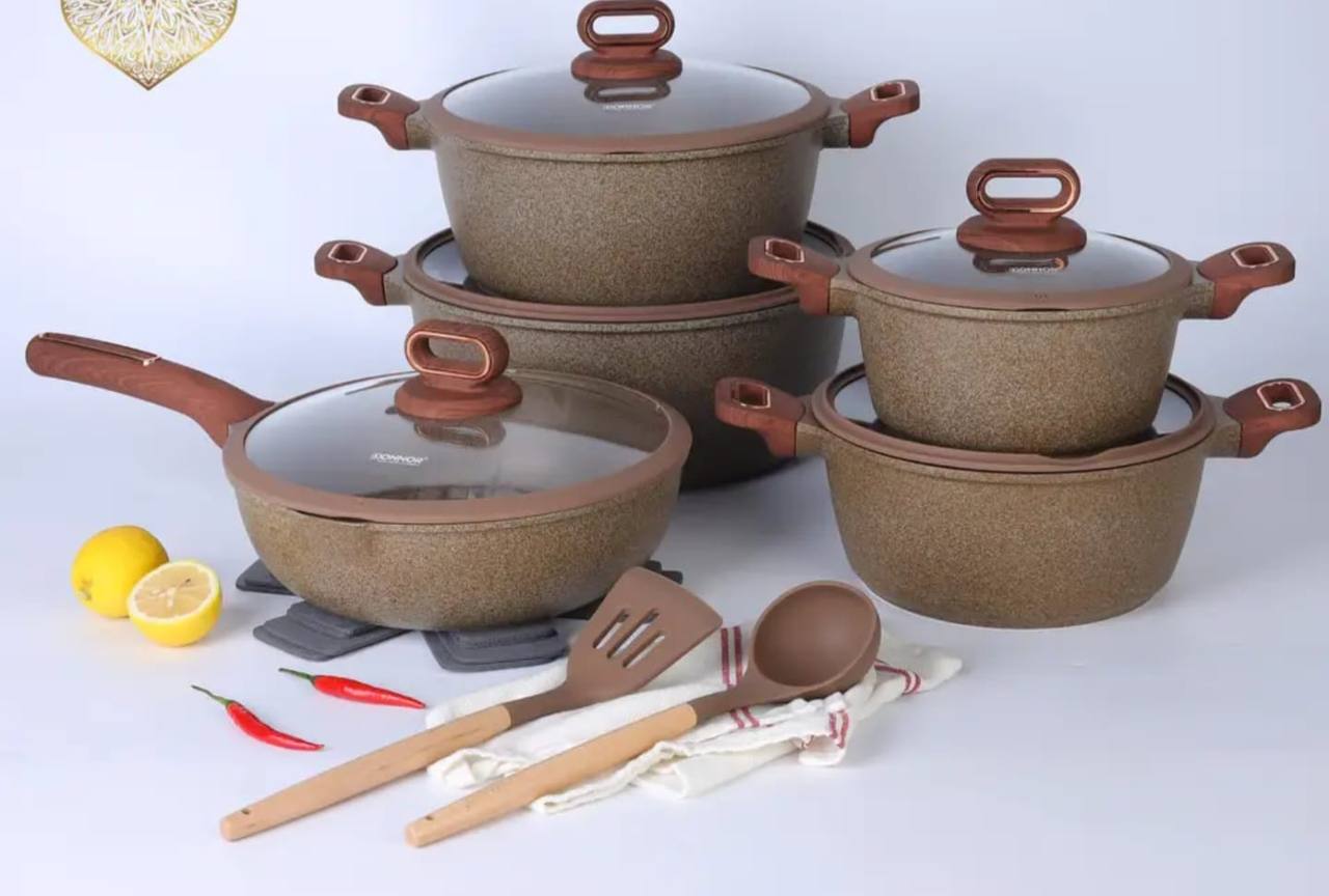 Upgrade your kitchen with the DONNOR 15-piece cookware set! Premium quality, PFOA/Lead/Cadmium-free non-stick. Includes casseroles, frying pan, silicon spoons, and pot protectors. Induction bottom, durable, versatile, and perfect for effortless cooking.