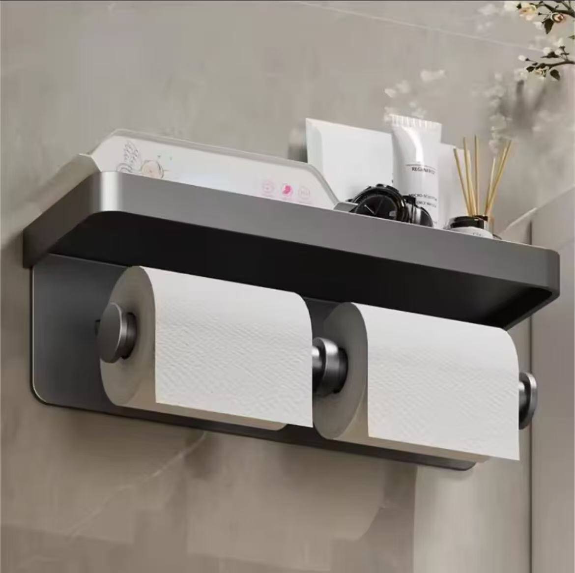 Upgrade your space with this double roll wall-mounted paper holder. Made from durable aluminum alloy, it requires no drilling and includes a top storage shelf—perfect for bathroom or kitchen convenience and modern style.