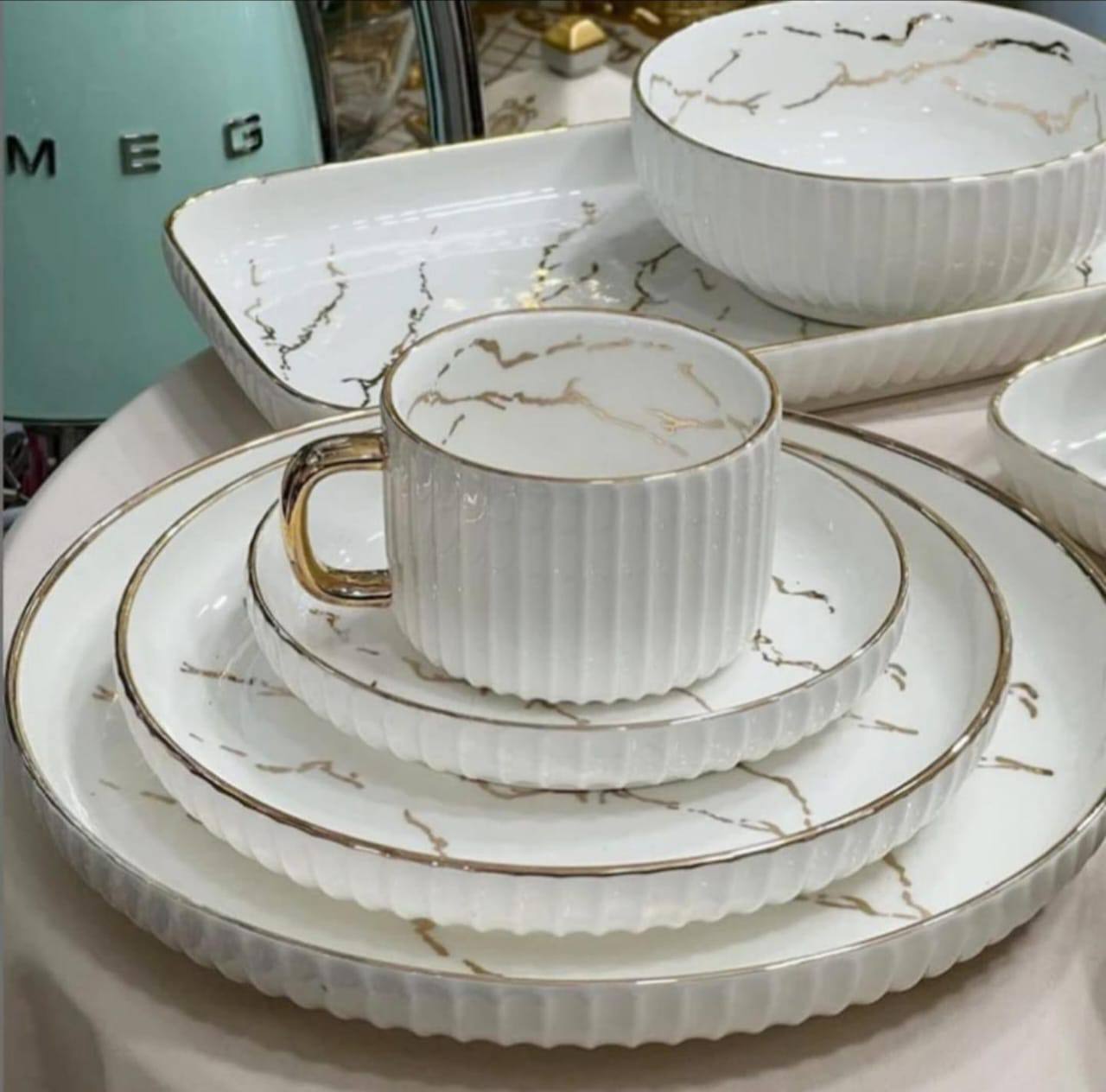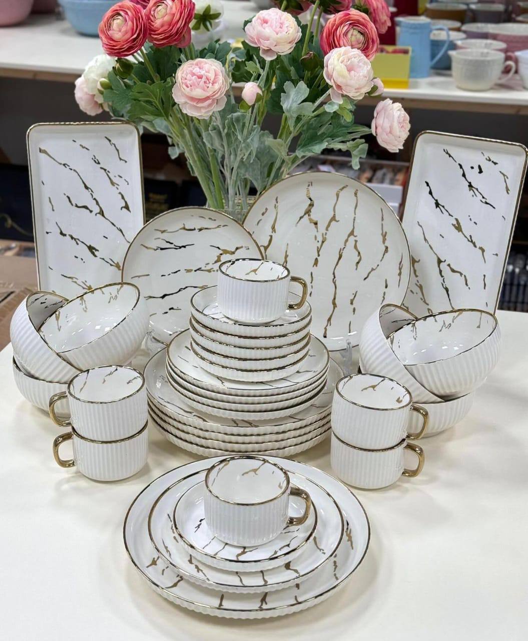 Experience luxury dining with this elegant 32-piece European porcelain dinner set. Featuring dinner plates, side plates, soup bowls, mugs, saucers, and rectangular platters, it’s perfect for hosting. Crafted for sophistication and durability, this set elevates every meal, from casual dining