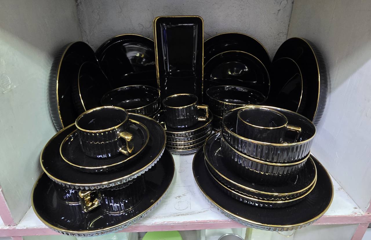 Dine in elegance with this 32-piece European porcelain dinner set. Includes 6 dinner plates, side plates, soup bowls, mugs (220ml), cup saucers, and 2 rectangular platters—perfect for stylish entertaining and everyday luxury dining.