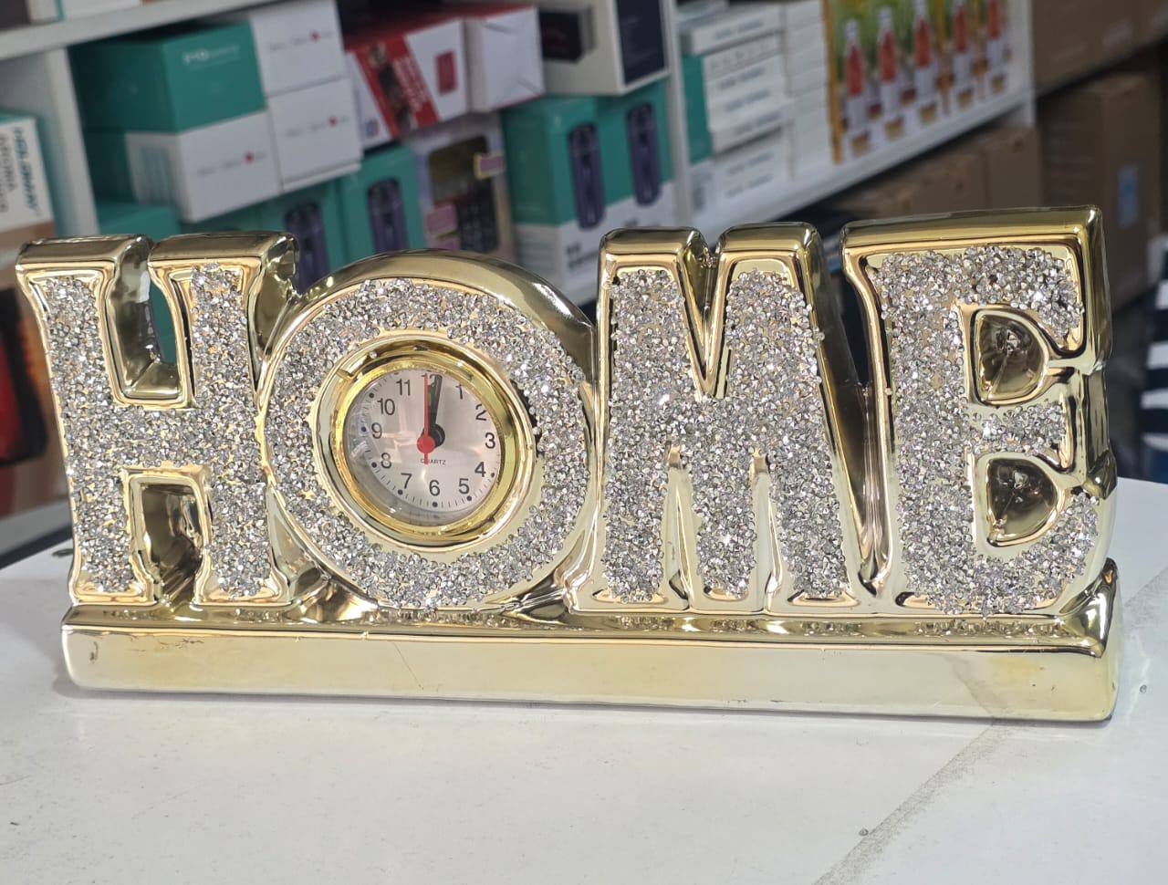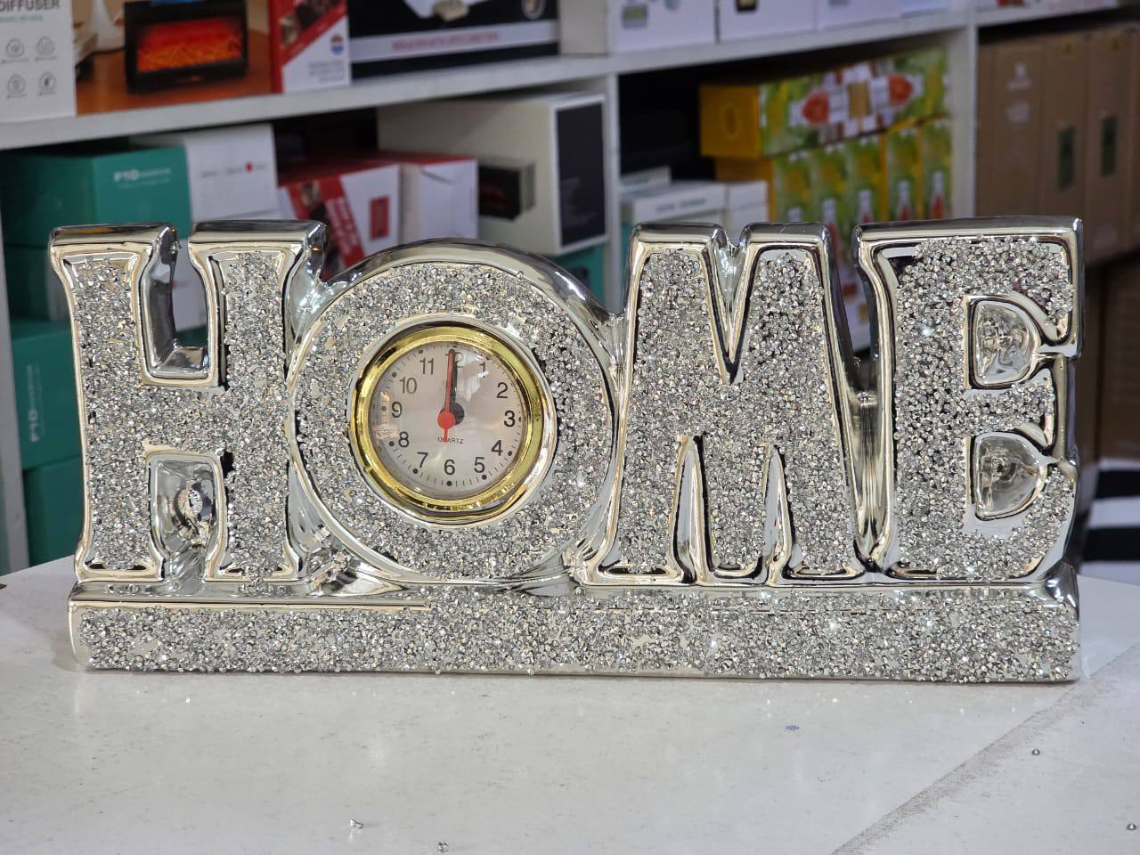 Add sparkle and style with this elegant glittery "HOME" tabletop clock. Featuring a gold and silver finish, quartz movement, and resin build, it's perfect for living rooms, offices, or as a thoughtful, decorative gift.