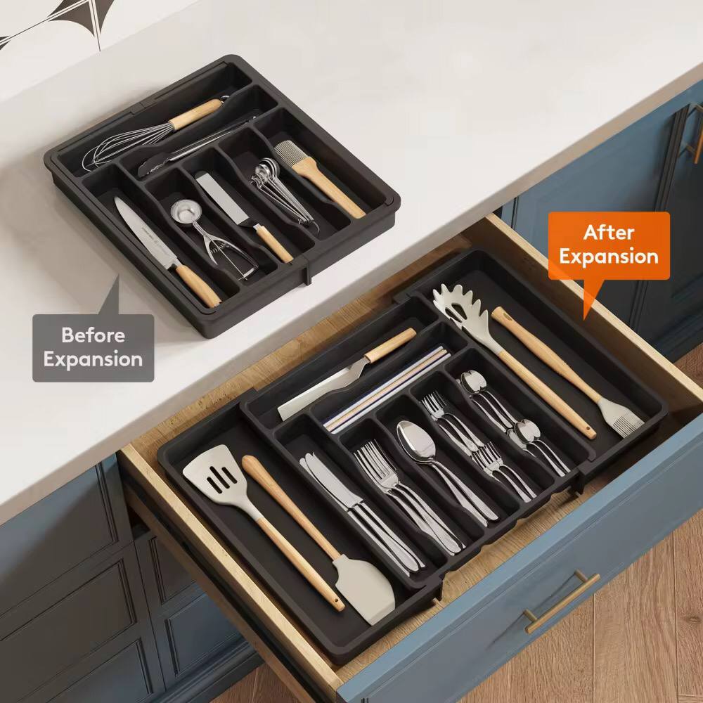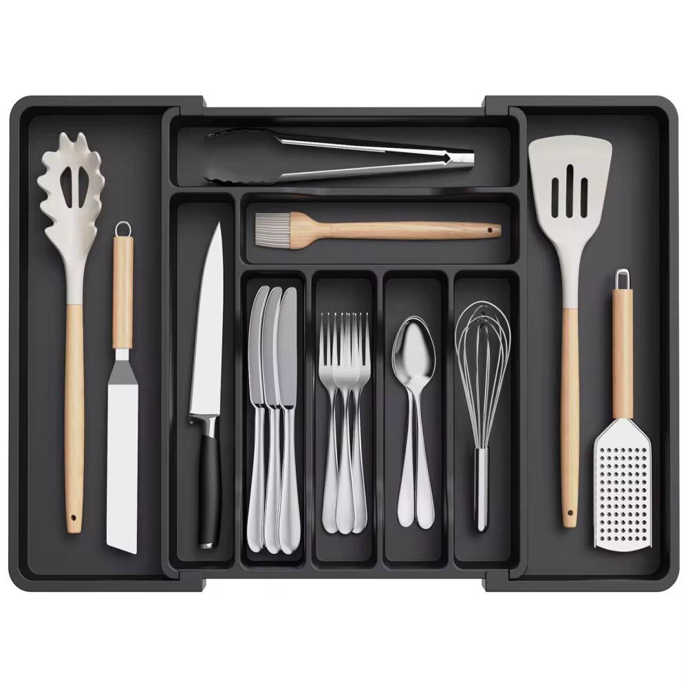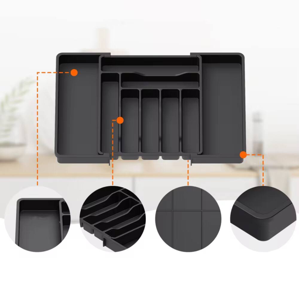 Keep your kitchen tidy with our sleek expandable cutlery organiser – available in black and white. Adjustable to fit any drawer, it offers stylish, clutter-free storage for all your utensils.