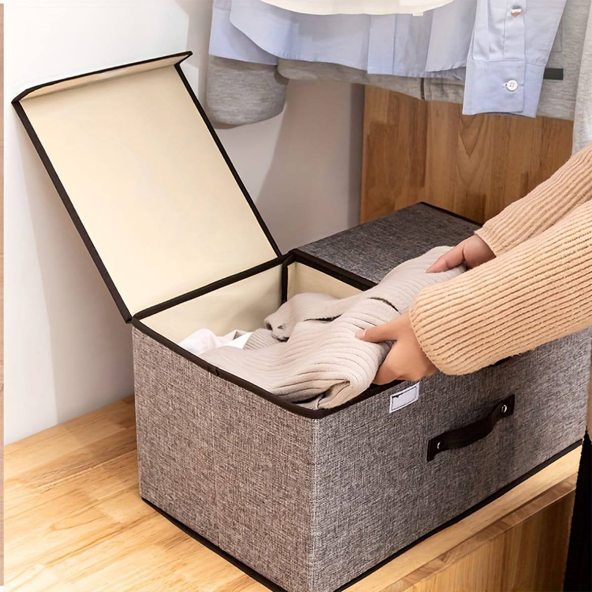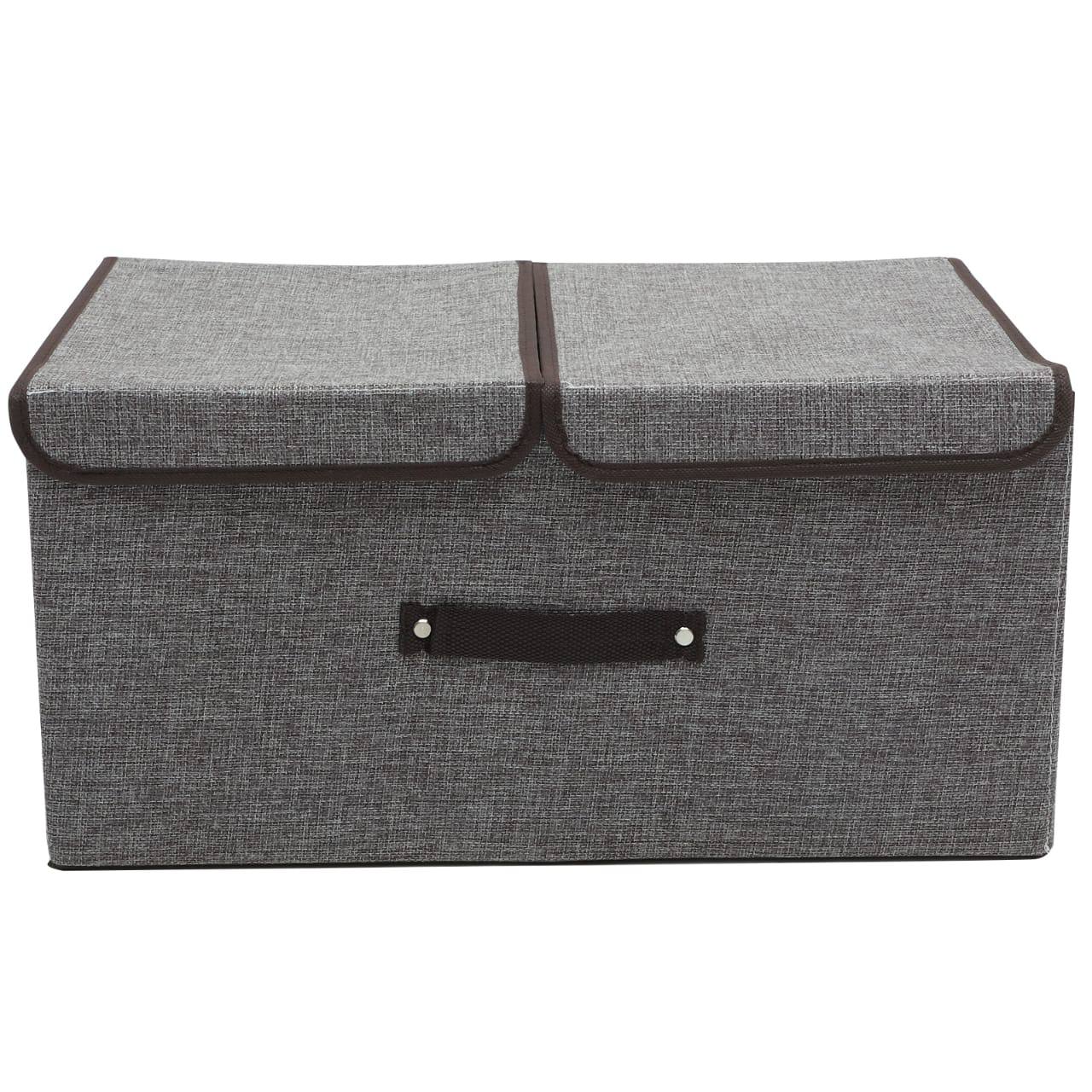 Organize effortlessly with this foldable cotton-linen closet storage box. Featuring a double cover and internal partitions, it's wear-resistant, durable, and space-saving. Ideal for clothes or accessories. Stylish grey color. Size: 50×25×30cm.