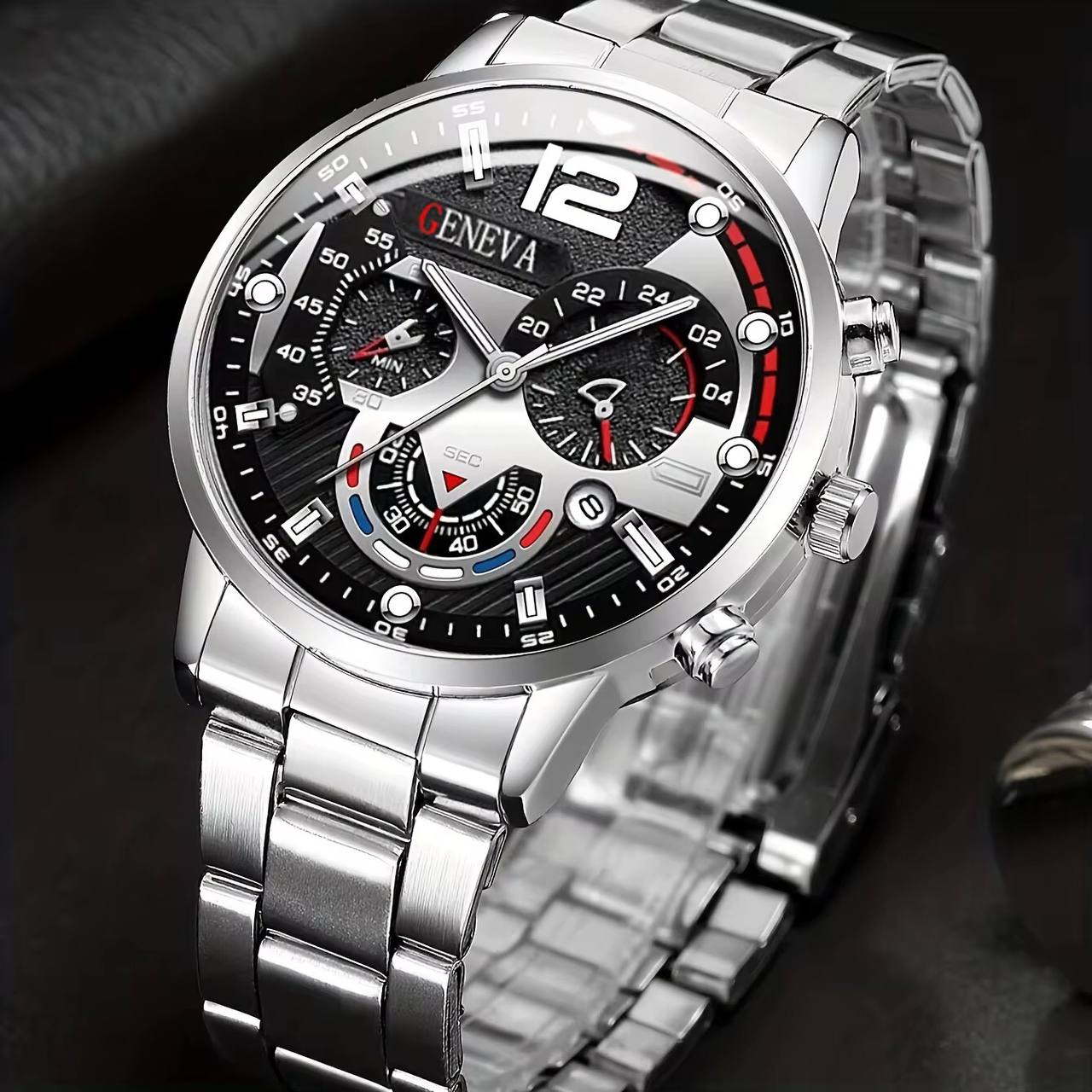 Sophisticated GENEVA Men’s Wrist Watch—a timeless piece of style and function. Available in Silver and Gold, elegantly packaged in a sleek black box. Perfect for gifting or daily wear. DM or call to order now!