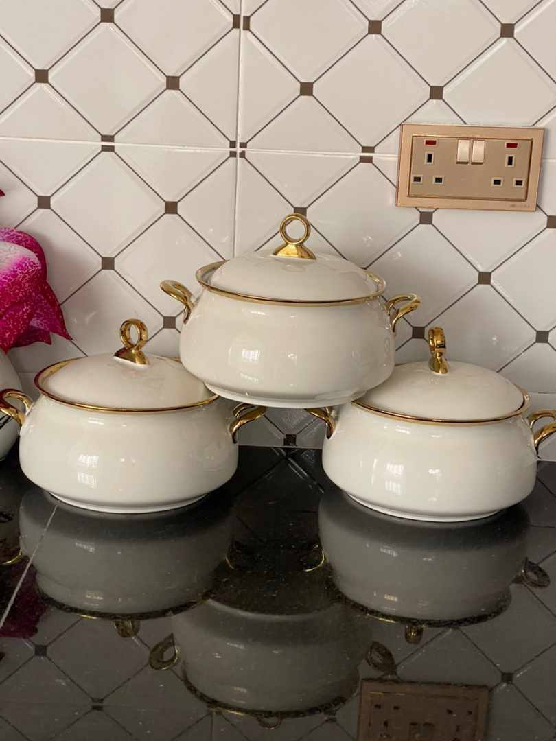 Serve in elegance with this 3pcs Gold Line Ceramic Dish Set. Each dish holds 3 liters, perfect for family meals or special occasions. Durable, stylish, and timeless—adds a luxurious touch to your tableware collection.