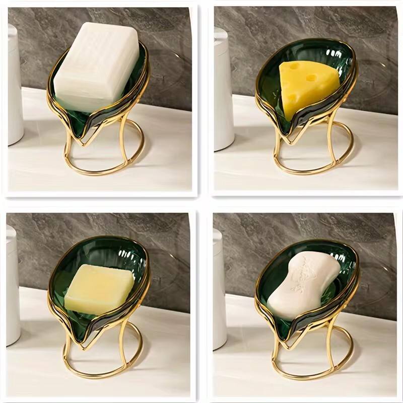 Keep your soap dry and stylish with the Happy Life 45° Slanted Self-Draining Soap Dish. Featuring a golden stand, it prevents soggy soap, ensures quick drainage, and adds a touch of elegance to any bathroom.