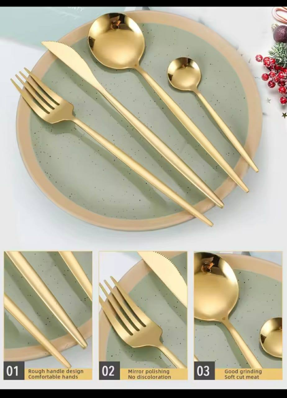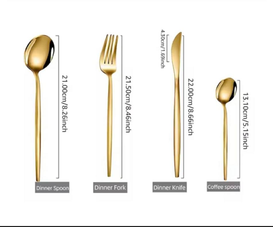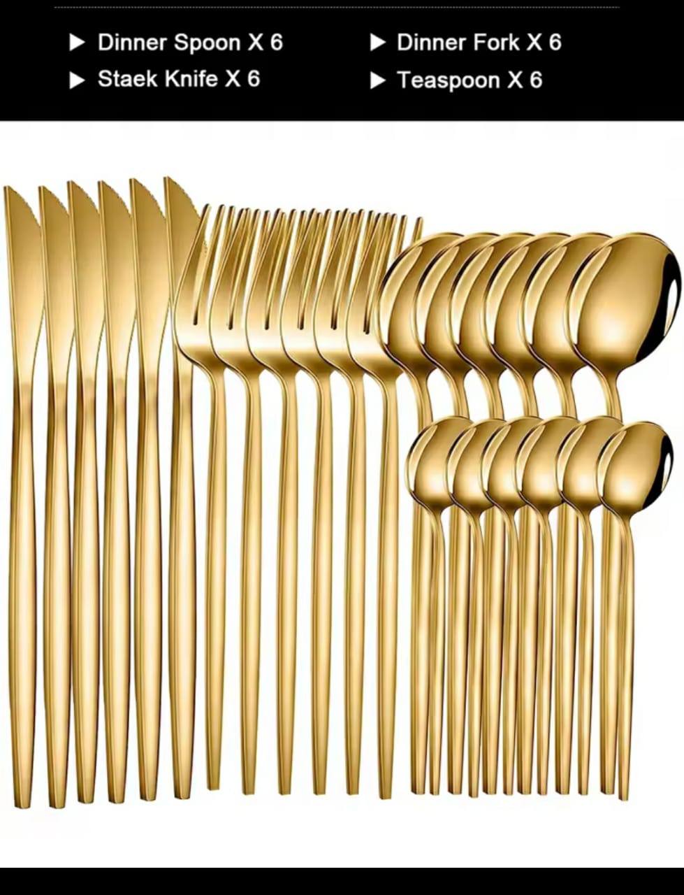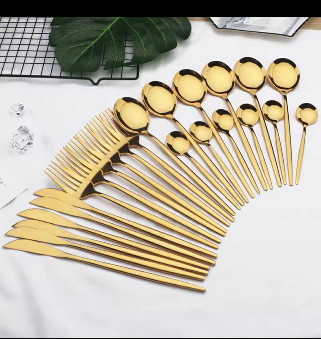 Upgrade your table with our heavy-duty 24pcs dining cutlery set! Each set includes 6 forks, 6 knives, 6 tablespoons, and 6 teaspoons. Durable, elegant, and available in a luxurious gold finish—perfect for any occasion.