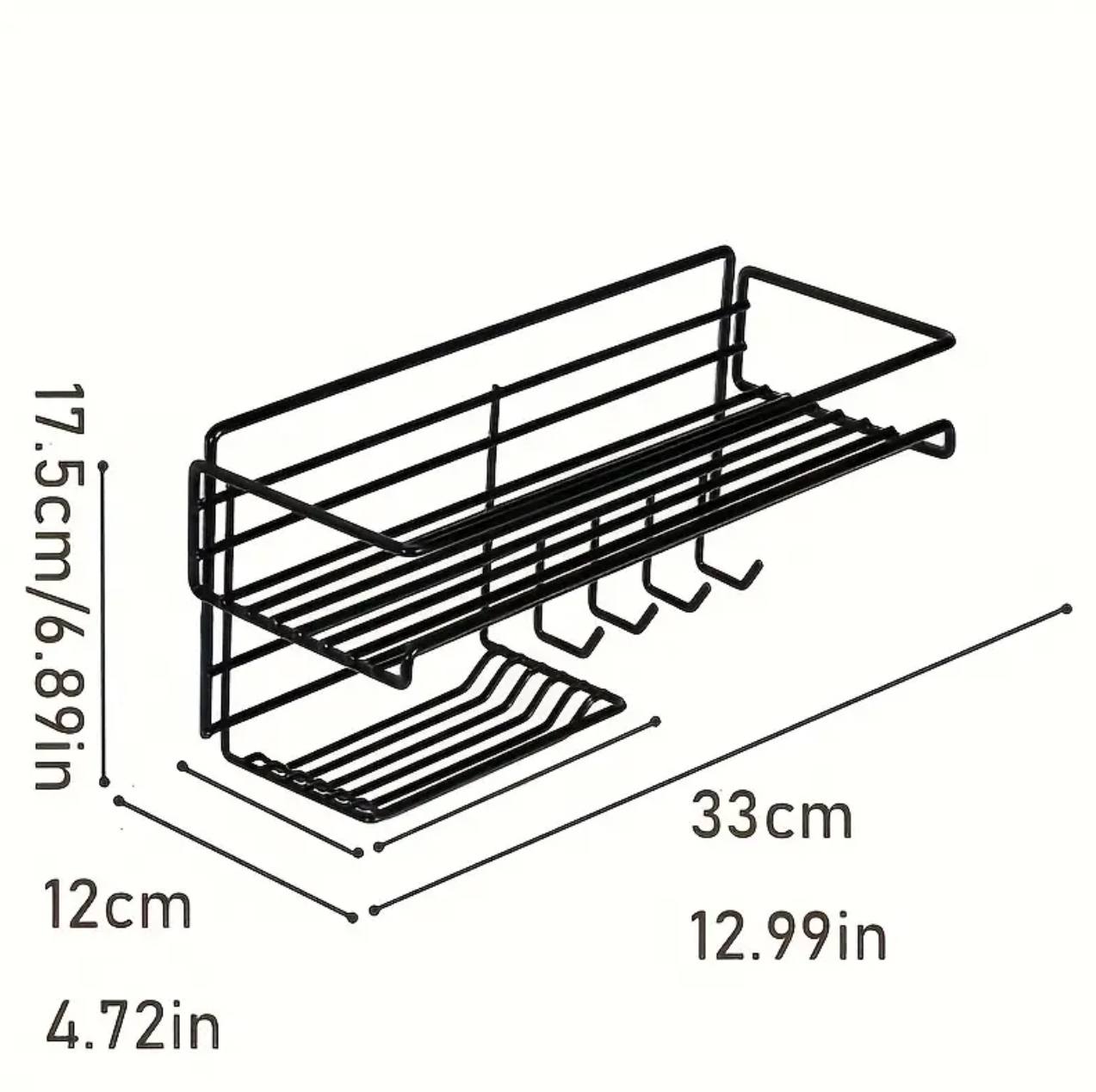 Upgrade your bathroom with this heavy-duty rectangular self-adhesive rack! Featuring a spacious 33x12x15cm design, rustproof metal construction, and hooks for added convenience. Perfect for organizing shower essentials in style, its sleek black finish complements any modern bathroom decor.