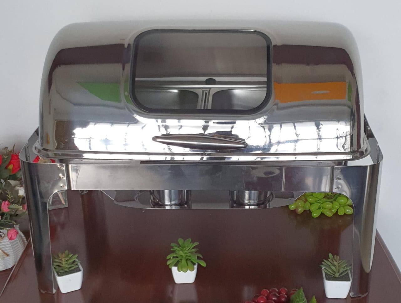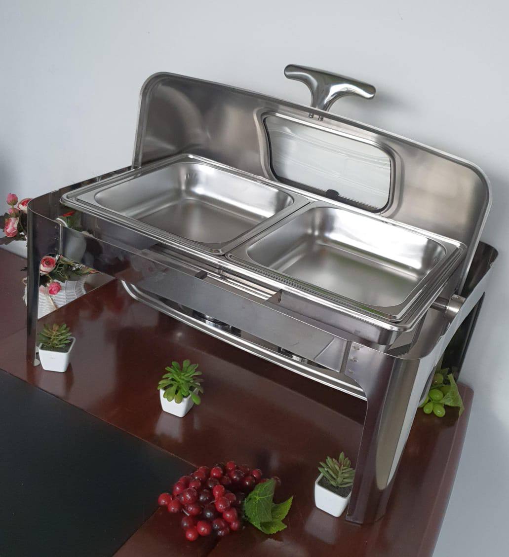 Elevate your catering setup with our heavy gauge stainless steel chafing dish—now in stunning silver! Features flip dome cover with watch glass, double food tray inserts, and two warmers. Stylish, durable, and functional.