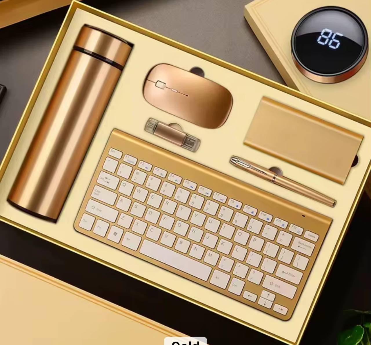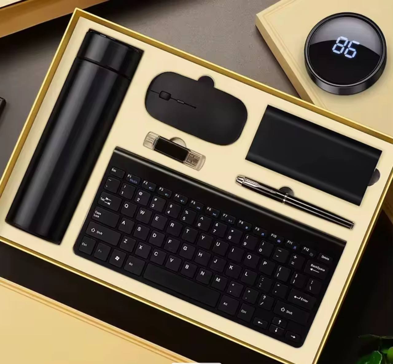 Impress clients and staff with this high-end business gift set in elegant gold and black. Includes a wireless keyboard and mouse, power bank, flash disk, thermal cup, and pen. A premium package that combines style, utility, and sophistication