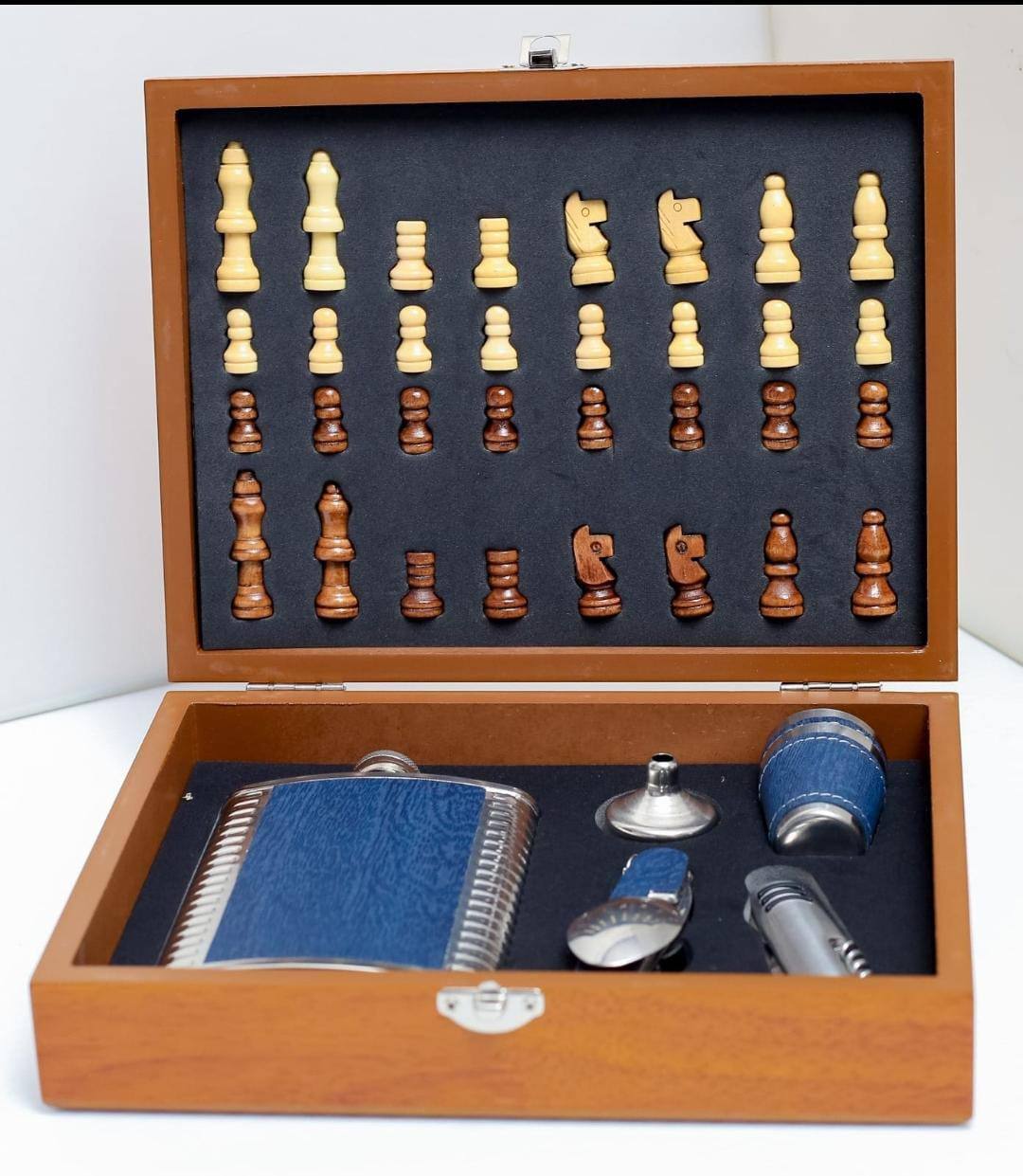 Elevate gifting with the Hip Flask Chess Gift Set. Includes a 250ml hip flask, 2 shot glasses, chess set in a wooden box, foldable utensils, and custom name engraving. A luxurious, multifunctional gift perfect for any occasion!