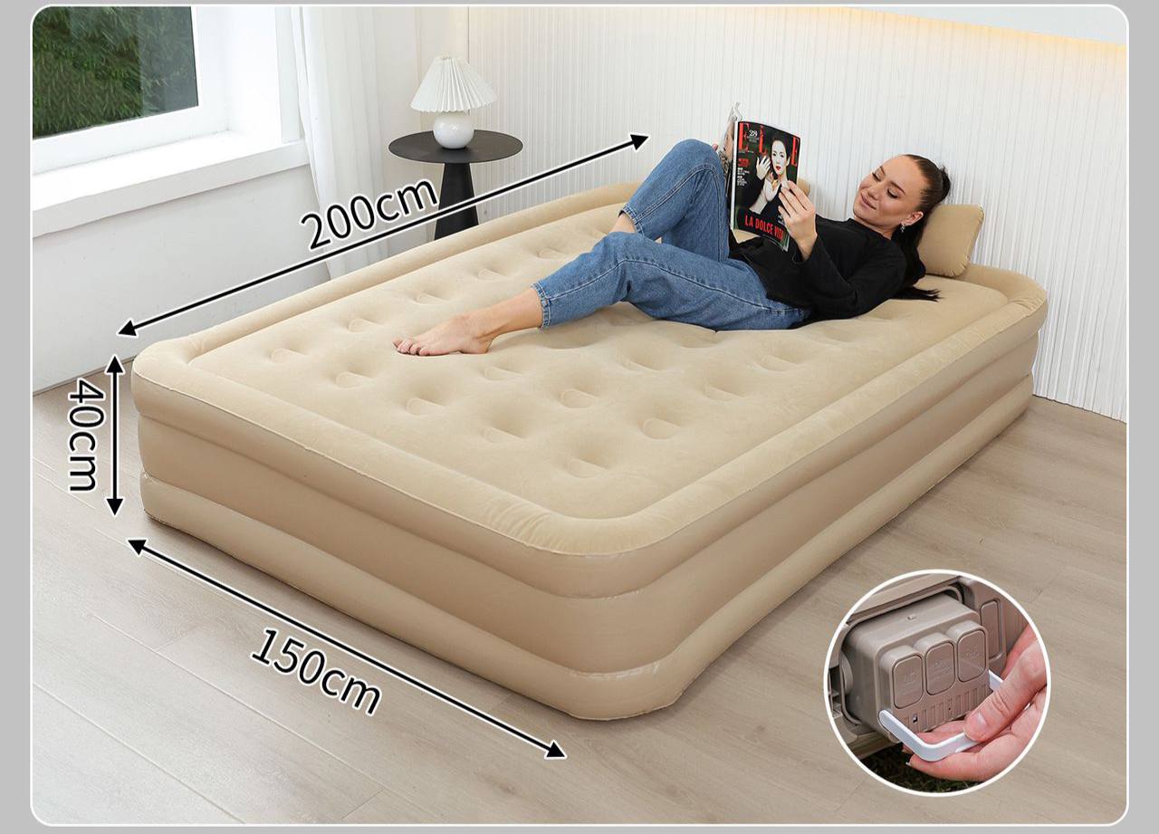 Experience ultimate comfort with this inflatable queen-size airbed mattress. Featuring an in-built electric pump and 2 pillows, it self-inflates to 200×150×40 cm. Perfect for home, travel, or camping—plush, durable, and convenient for restful sleep anywhere.