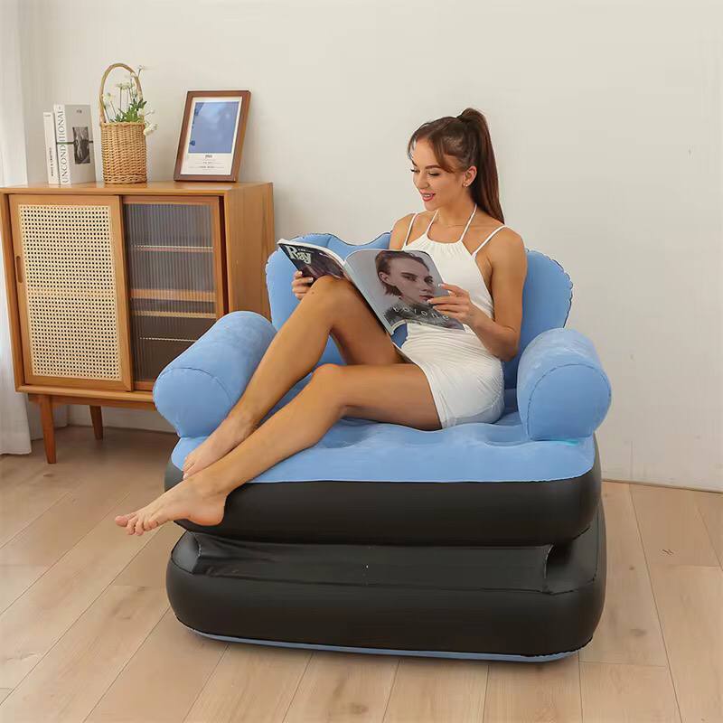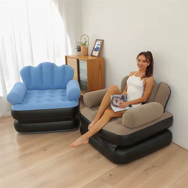 Relax in comfort with the 2-in-1 Inflatable Sofa or Bed! Easily converts from a cozy sofa (100x98x90cm) to a spacious bed (198x98x70cm). Comes with armrests and a manual pump. Available in blue and beige. Perfect for any space—order now