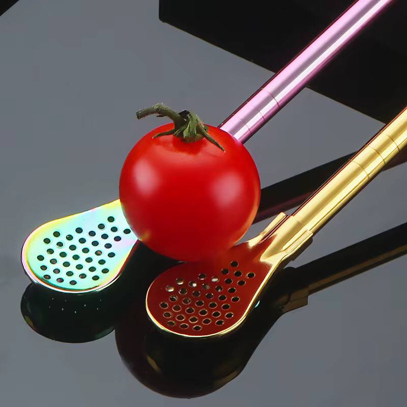 Innovative 3-in-1 utensil: straw, stirring spoon, and strainer. Made with reusable stainless steel, featuring dual-sided filter holes for effortless tea brewing. Portable, durable, and convenient, perfect for enjoying beverages anytime, anywhere with ease and comfort.