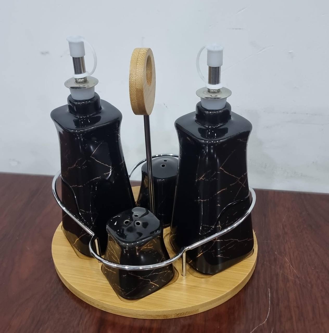 Elegant JA7009-H28 Set — includes 4 ceramic pieces: gravy boat, seasoning container, oil dispenser, and shakers, all on a stylish bamboo base. Perfect for organized, classy table settings while serving sauces, oils, and spices in style.