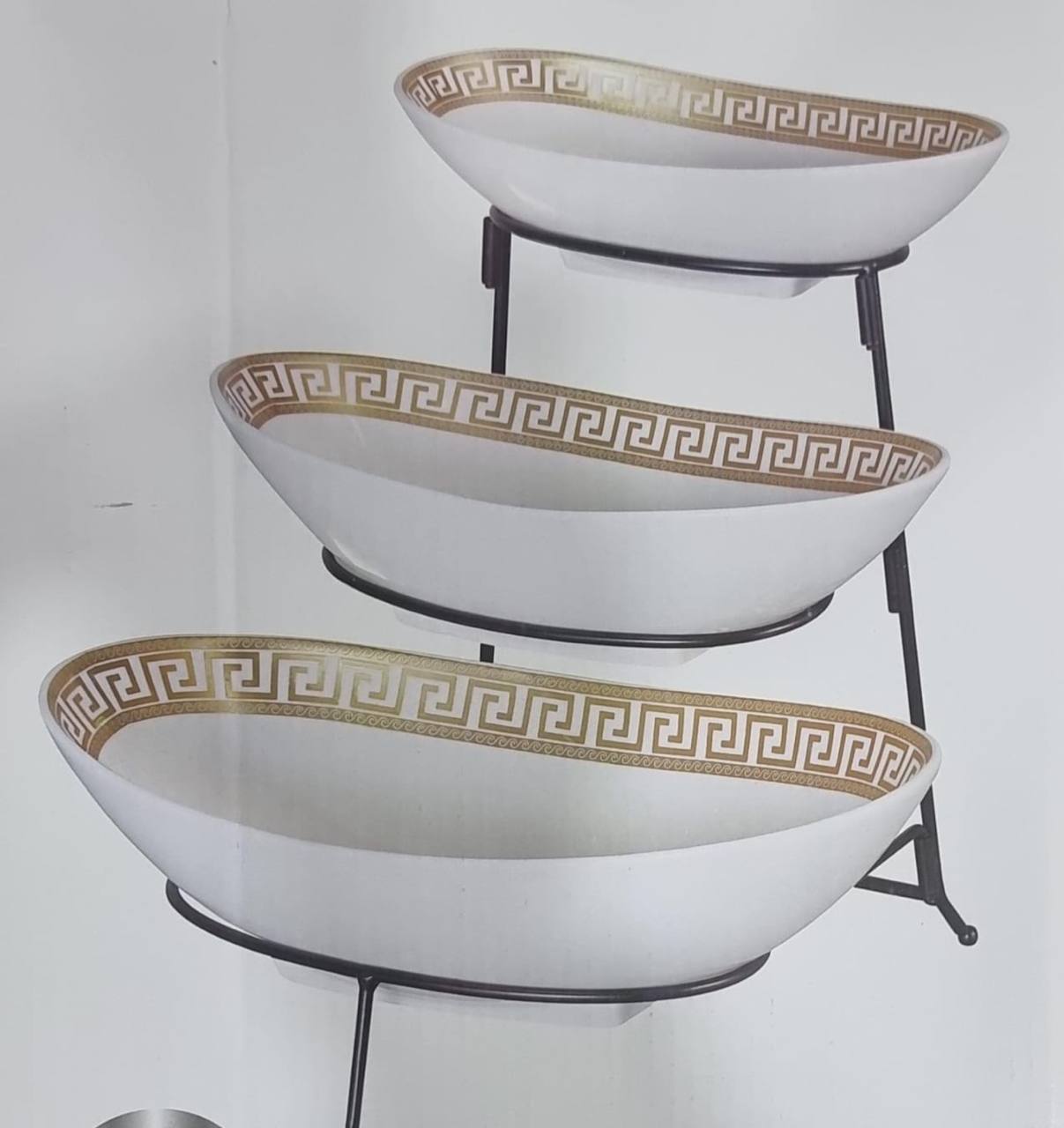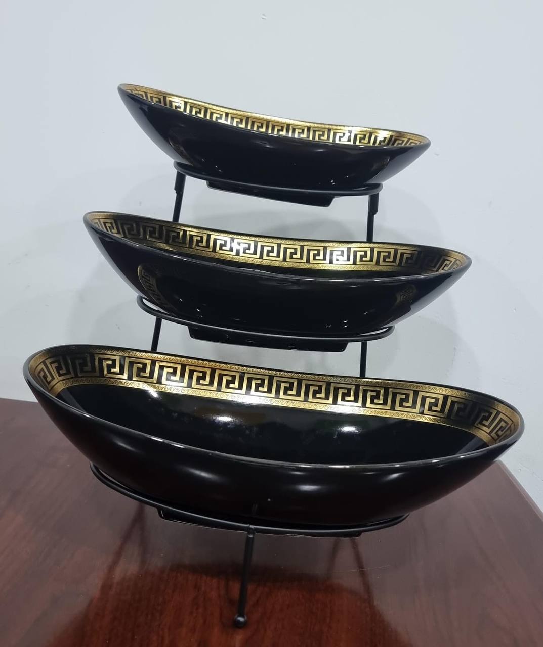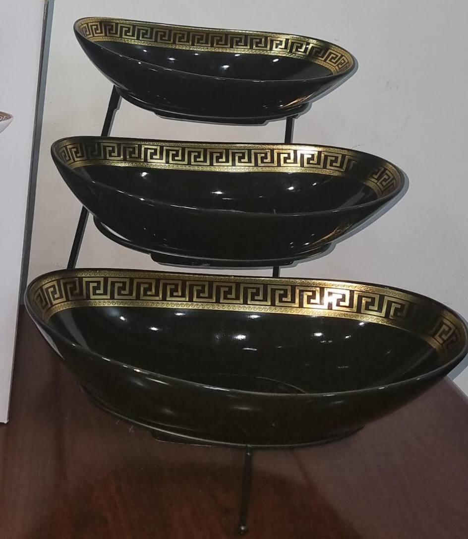 Display and serve beautifully with the JD8302-Y482 Set of 3 Ceramic Fruit Plates on a sleek black metal rack. Perfect for fruits, snacks, or desserts—durable, stylish, and ideal for everyday use or special occasions!