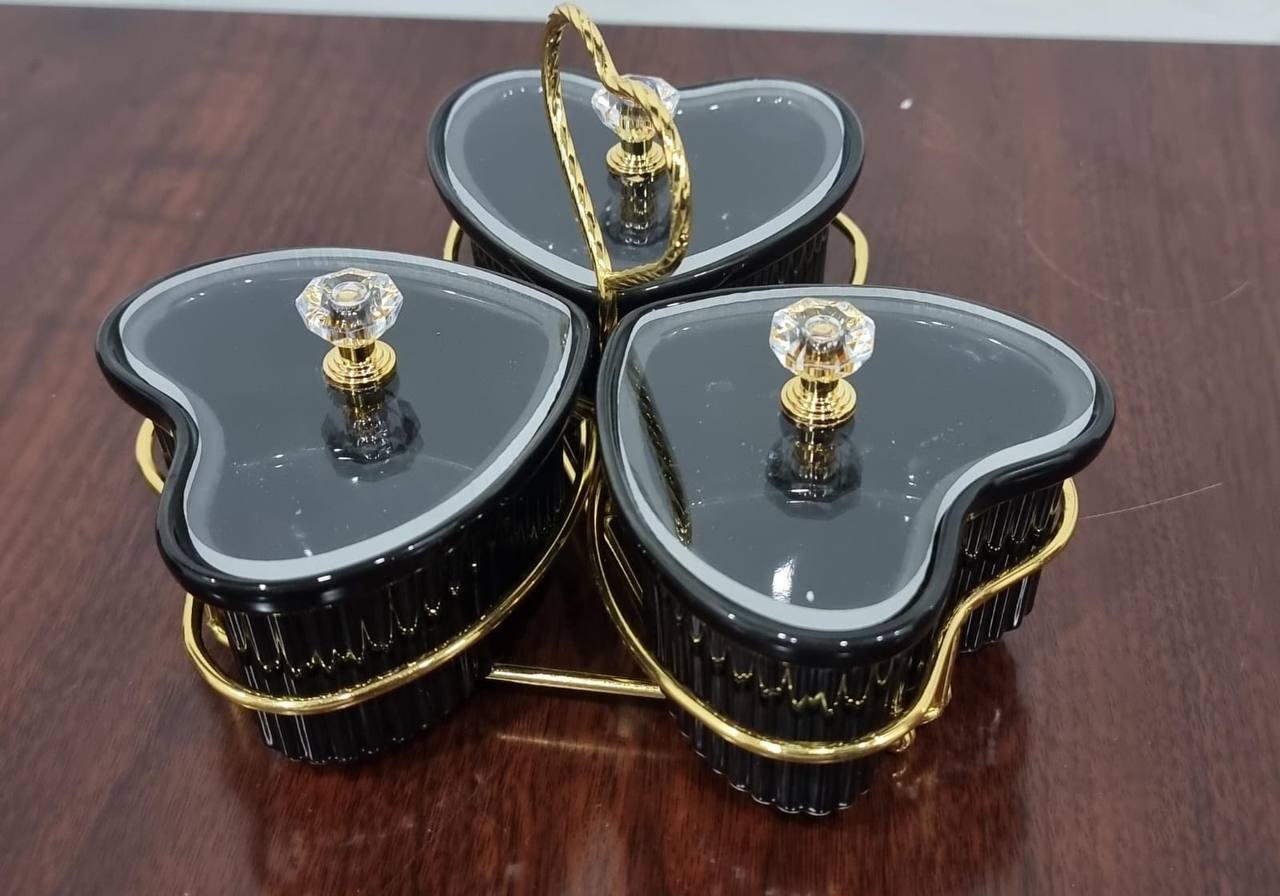 Serve in style with the JD8682 Set of 3 Ceramic Love-Shaped Sugar Bowls. Featuring acrylic lids and a chic gold metal rack—perfect for sugar, spices, or condiments. Elegant, durable, and ideal for kitchen or gifting!