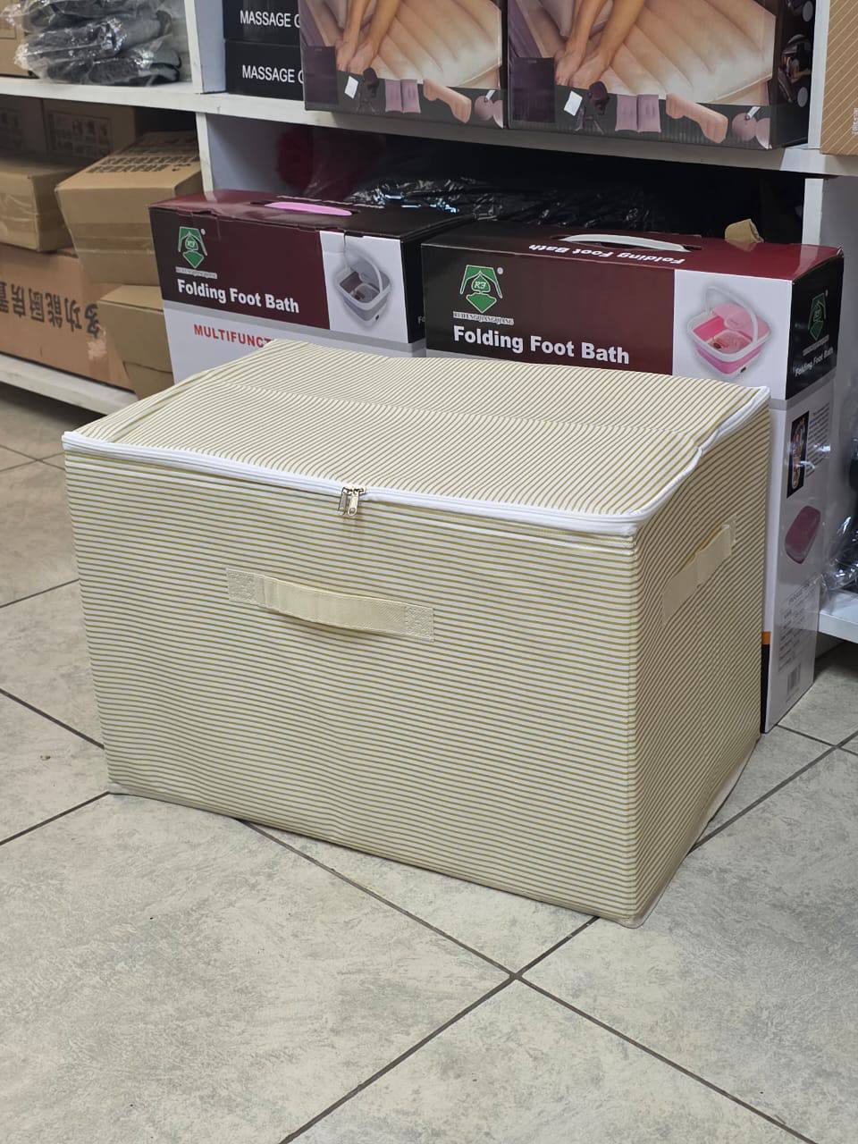 Declutter with this large-capacity collapsible zipper storage box. Perfect for organizing clothes, toys, and more in your wardrobe or closet. Durable, space-saving design in stylish grey or beige stripes. Size: 45×30×30cm.