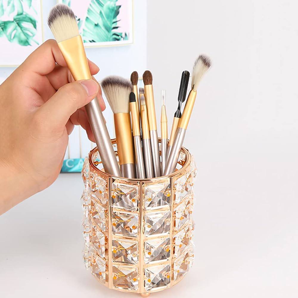 Glamorous Makeup Brushes with Sparkling Cylinder Case — in elegant golden finish. Keeps brushes organized, protected, and travel-ready. Adds luxury and style to your vanity while ensuring flawless makeup application. Practical, chic, and eye-catching.