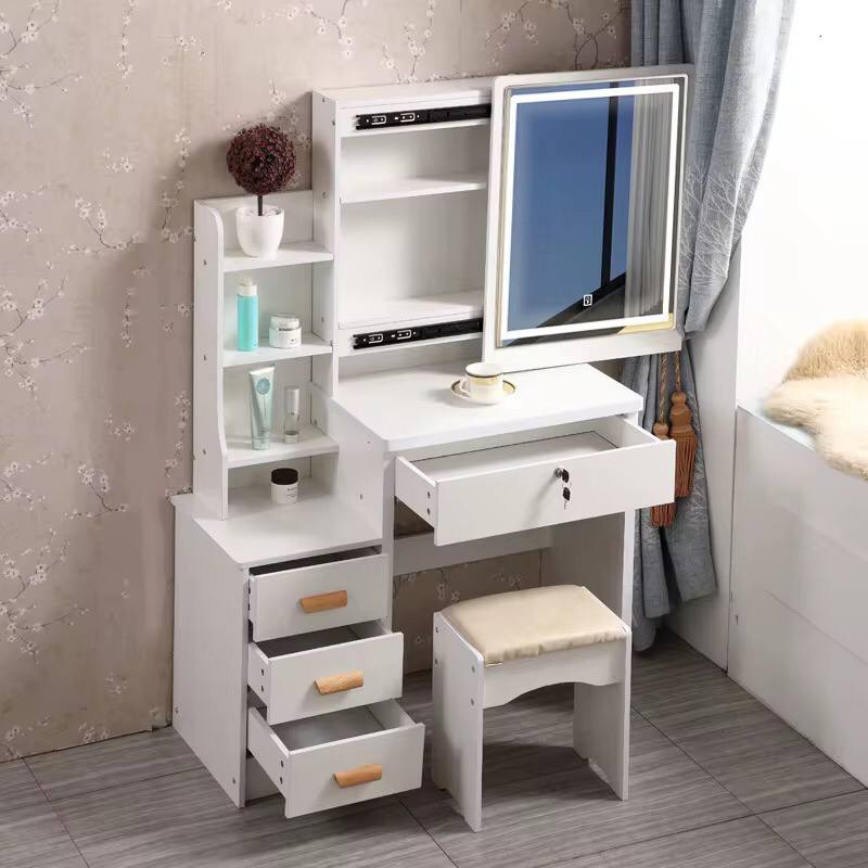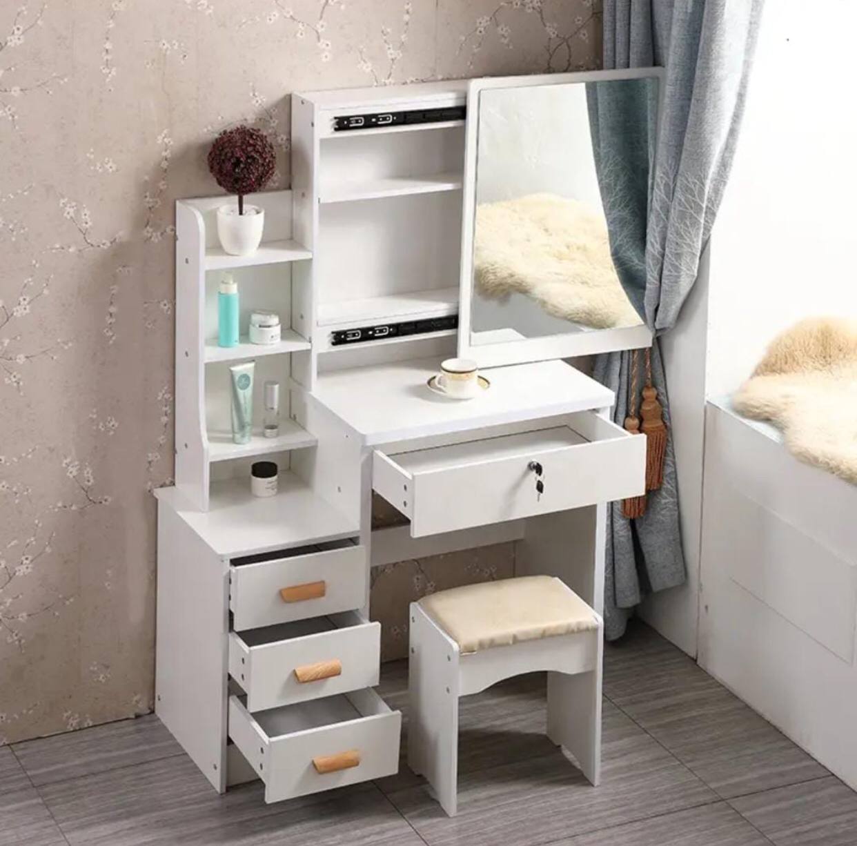 Enhance your beauty routine with our Makeup Desk featuring a sliding mirror, available with or without lighting! This elegant dressing table set includes 4 spacious drawers, a comfortable stool, and sleek 80x36x130cm dimensions—perfect for organizing makeup, jewelry, and essentials in style and comfort!