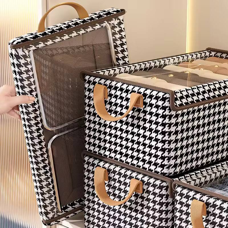 Keep your clothes neat and dust-free with the Metal Frame Wardrobe Organizer. This foldable storage solution features a transparent dust cover, handles for easy transport, and a checked design. Ideal for jeans and clothing, with a size of 50cm×20cm×30cm—perfect for any closet